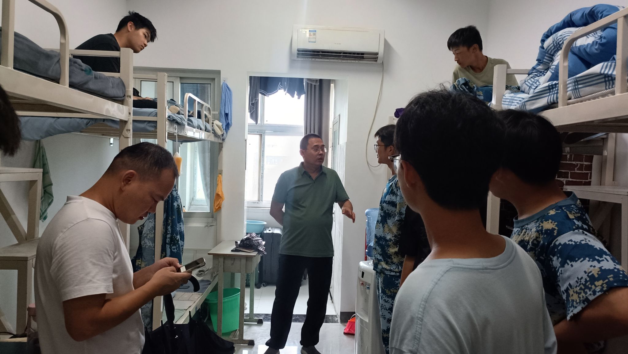 在走访宿舍时,孙权与学生面对面交流,详细了解学生在 “衣、食、住、行”等方面的情况,关切地询问大家对学校食宿情况是否适应,出行宿舍楼、餐厅、操场是否方便,生活上有无困难等。