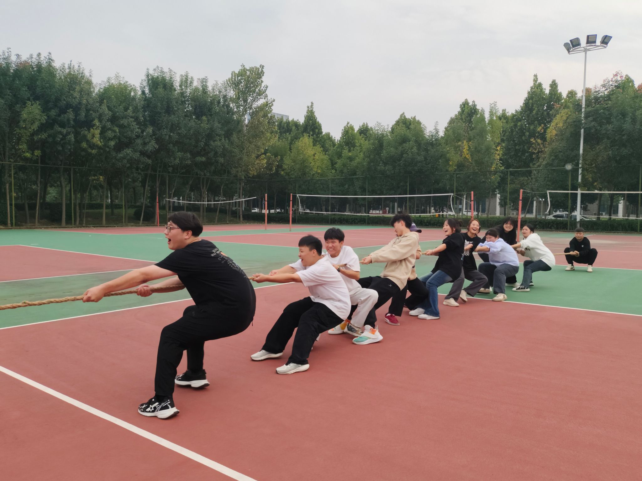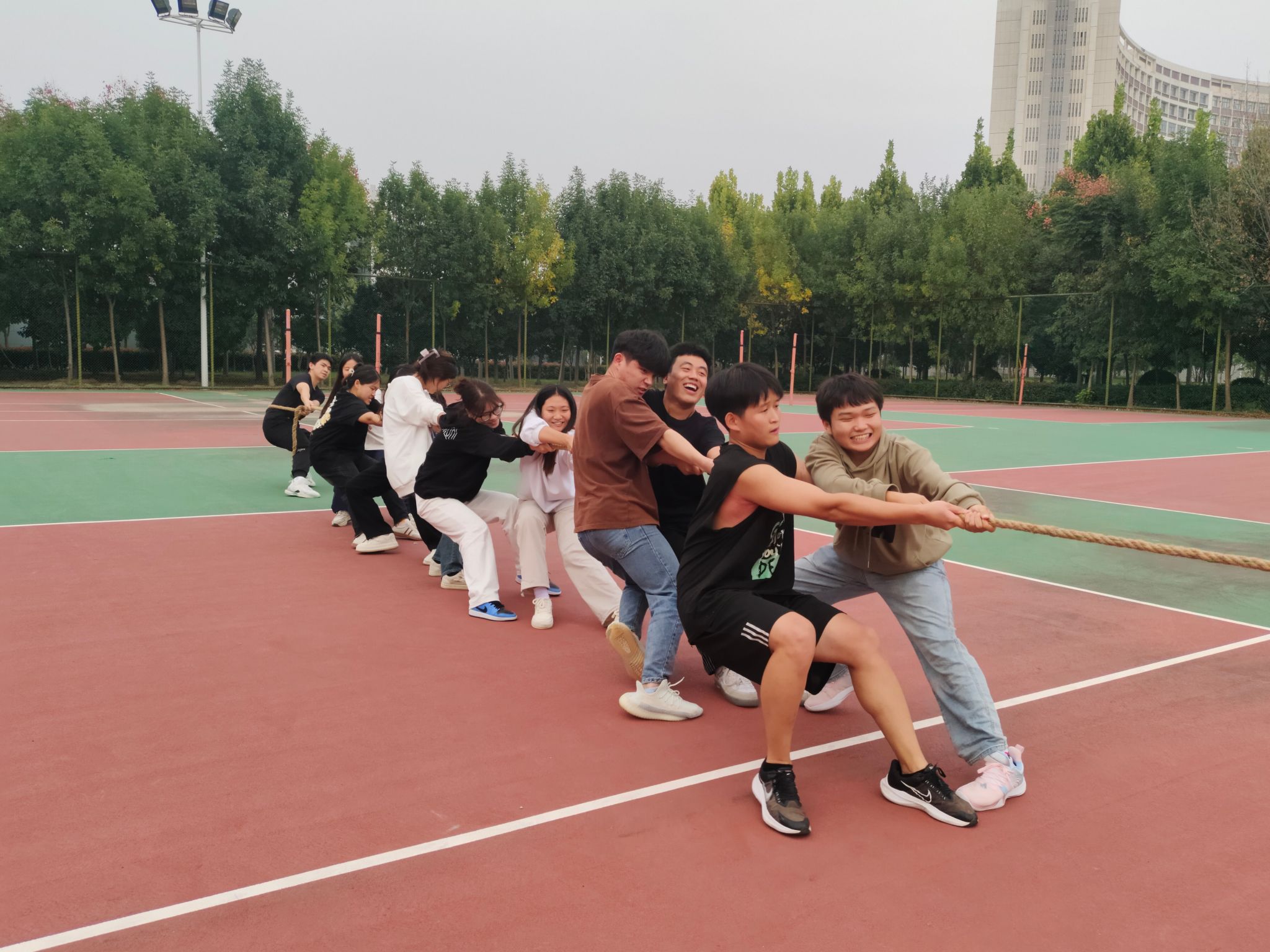 活动第一项是拔河比赛,比赛分为男生组、女生组以及男女混合组。比赛开始,同学们面色凝重,尽全力将绳子牢牢地握在手中,时而向后拉扯,时而向前推进,场面紧张激烈。队员们相互鼓励、互相配合,不仅展现了良好的团队合作精神,而且还赛出了水平,赛出了风格,赛出了新时代青年积极向上,顽强拼搏的精神风貌。