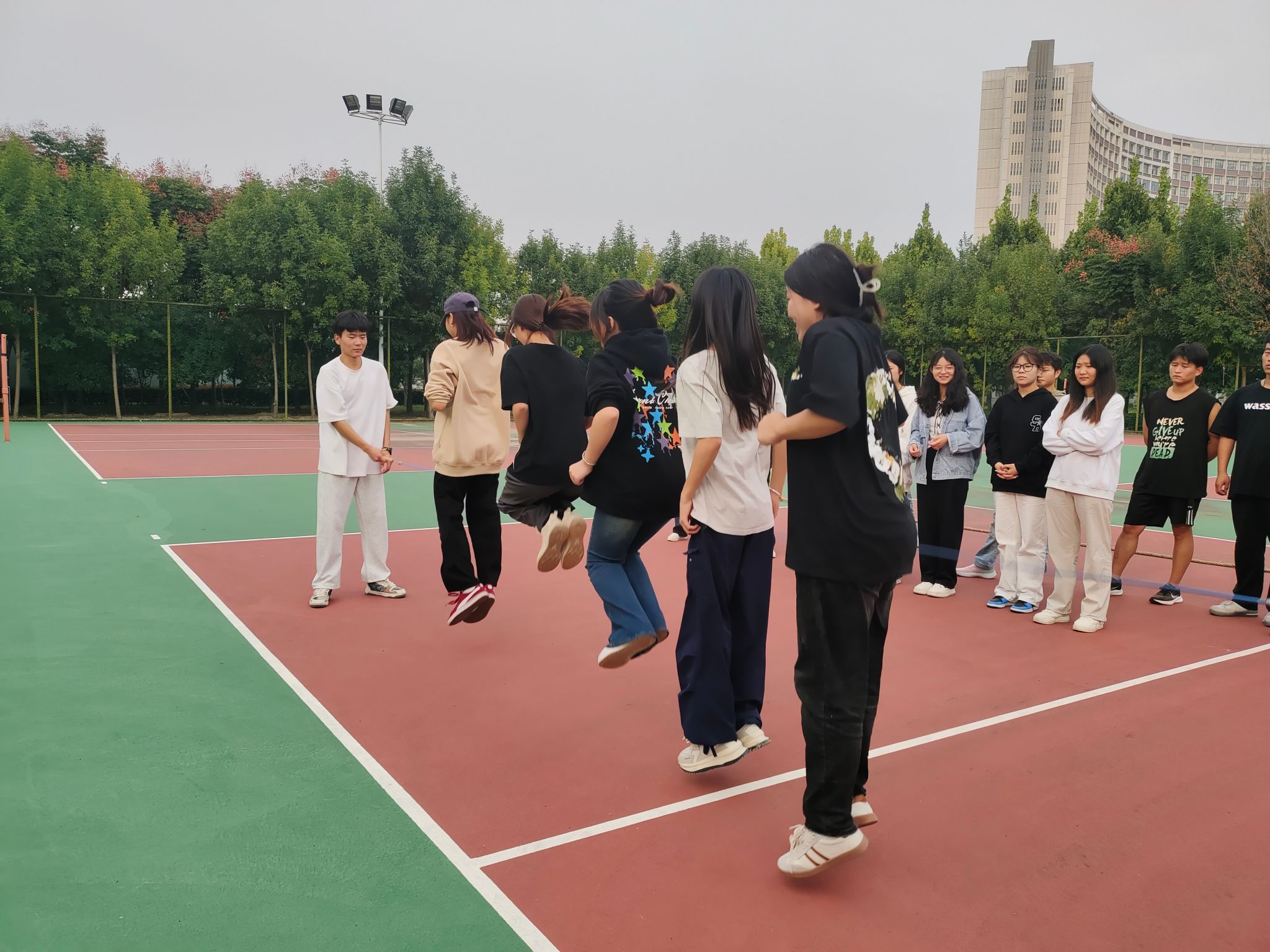 在跳大绳的比赛中,同学们纵身跃起,灵活地跃过绳子,回旋腾挪间展现了出色的身手和技巧。大家配合默契,用一个个轻盈腾空跃起的姿态勾勒出青春活力的身影,展示了团结协作的力量。