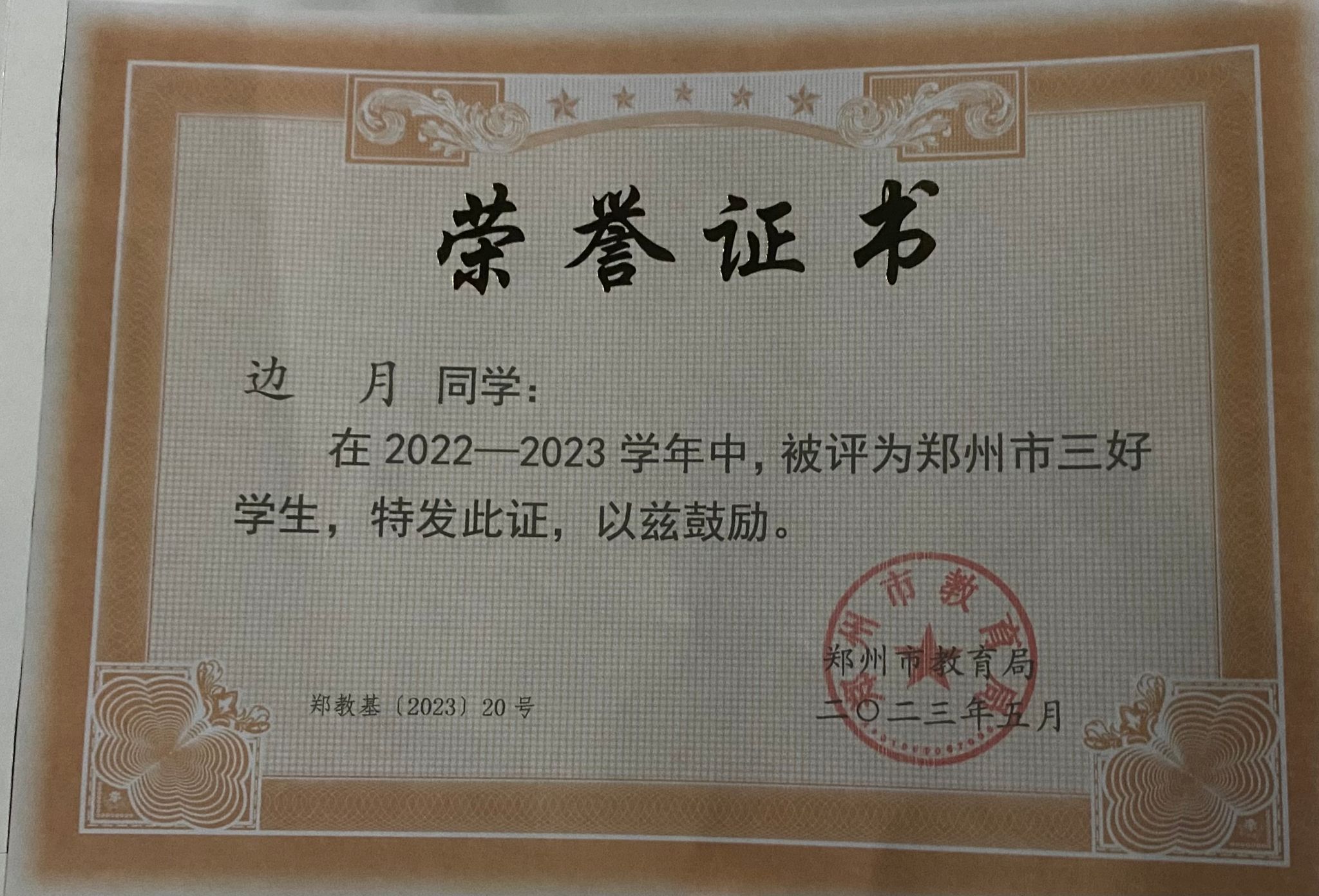 本人边月,女,中共预备党员,pp电子游戏平台网站国际工商学院19级五年制会计1班学生,班主任为孙文霞老师。在校期间,担任校团委宣传部副部长、副班长。荣获河南省三好学生、郑州市返家乡社会实践先进个人、2020、2023两年获得郑州市三好学生、校级优秀团员、优秀青年志愿者、河南省第十八届科技文化艺术节大赛三等奖等荣誉。