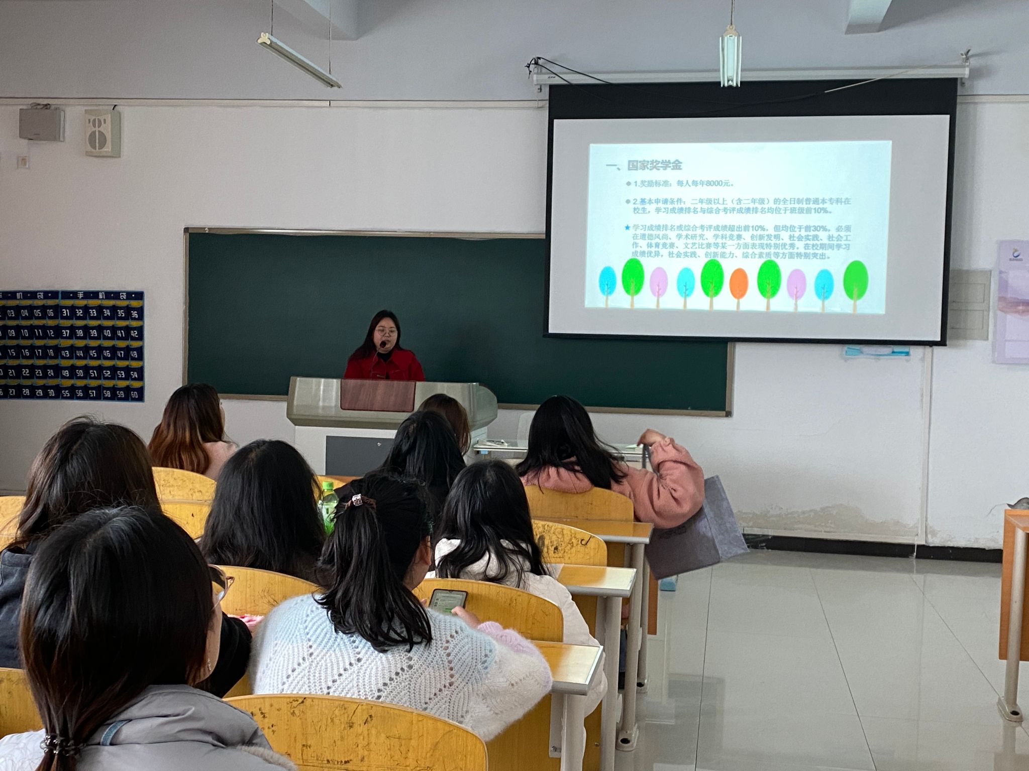 李冰老师在会议上讲解了国家奖学金、国家励志奖学金、国家助学金、国家助学金贷款、师范生免费教育、退役士兵教育资助、学费补偿助学贷款代偿、勤工助学、学费减免等项目的资助标准、对象、申报条件、评审流程、资金发放等方面内容。然后,对大家有疑问的地方进行了耐心的解答。最后,李冰老师引导学生在获得资助的同时,要懂得感恩、关爱他人、关爱社会,努力学习,要成为一个对社会和国家有帮助的人。