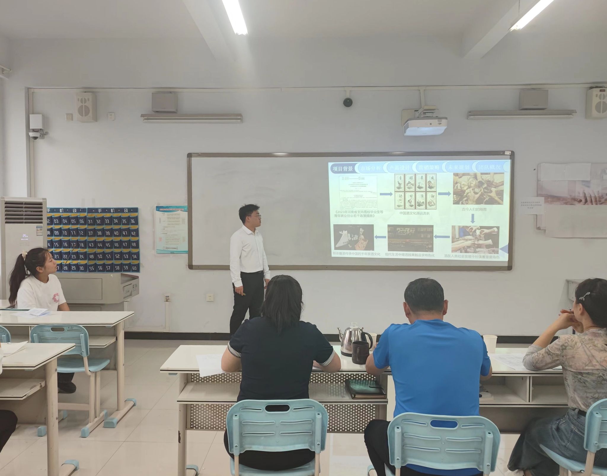 本次初赛采用项目演讲和答辩两个环节。在创新创业项目团队展示中,各团队从产品介绍、市场定位、商业模式、资金投入、营销策略、风险控制、创新地点等方面进行展示和介绍。评委小组认真听取大家的项目创意,根据学生演讲与答辩对每个项目进行了认真评估,并提出了许多宝贵的意见和建议。