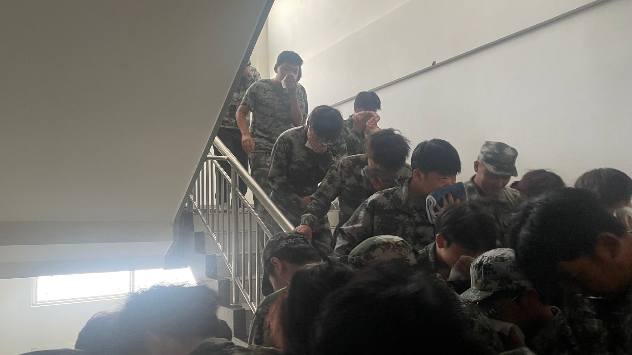 9月25日上午9:20随着消防警报声响起,全体师生迅速进入应急状态,新生辅导员与学生干部引导学生按照指定路线快速疏散。在演练中,全体师生捂住口鼻,躬身弯腰,顺着墙脚和楼梯扶手,快速撤离到操场安全区域。到达指定位置后,教官清点人数,并向演练总指挥报告,确保每一位学生安全撤离,无一人遗漏。