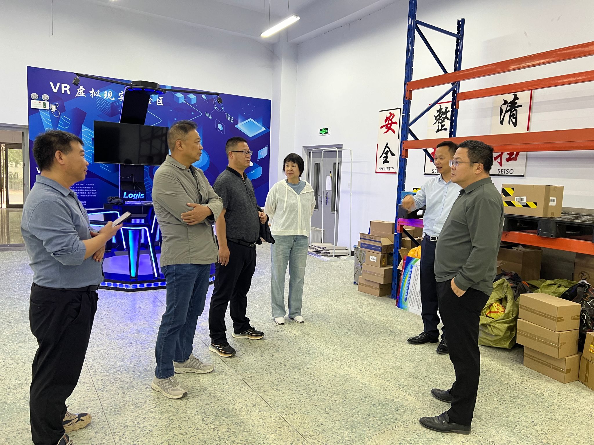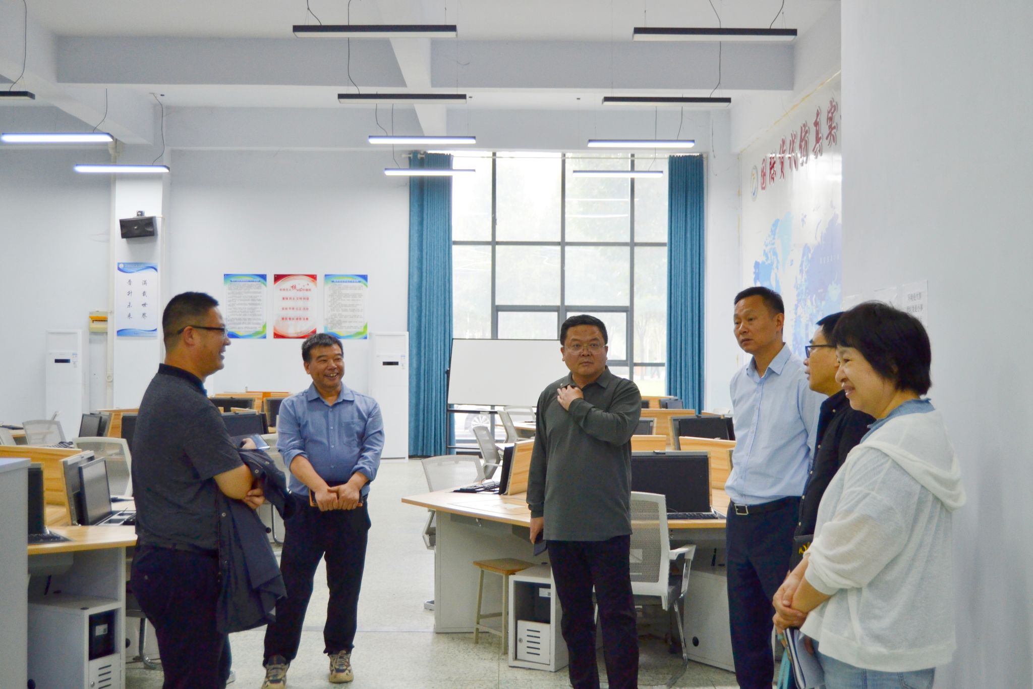 张建军一行先后视察了电子商务京东实训室、国际货代与仿真实训中心、智慧物流综合实训室、创新金融会计实训室、ERP实训室、仓配综合实训室等实训室。调研过程中,各实训室负责人介绍了实训室的基本设施、使用状况、教学开出率等,调研组一行仔细察看了解了实训室的设施设备和实践教学情况,指出实训室建设与管理存在的问题,并就实训室未来的发展规划提出了宝贵意见。