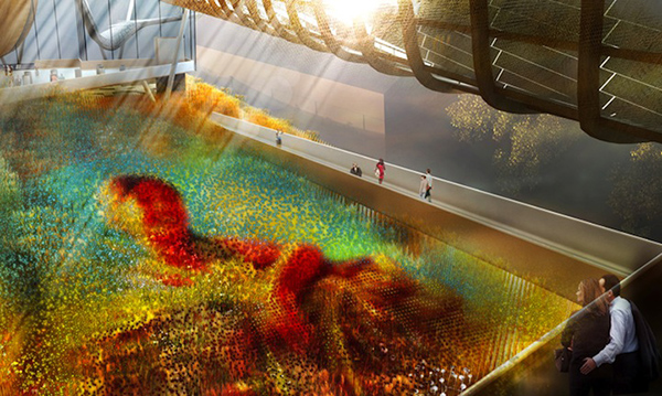 走进展馆,将有来自中国点 40 个省市为你展示它们自己的的文化与产品,场馆中央设有一个多媒体设备为观众呈现「希望的田野」,每一个 LED 灯模拟出小麦的「茎秆」,在享受了视觉、听觉以及简短的视频之后,观众还可以站在周围升降台上领略场馆广阔的视野。