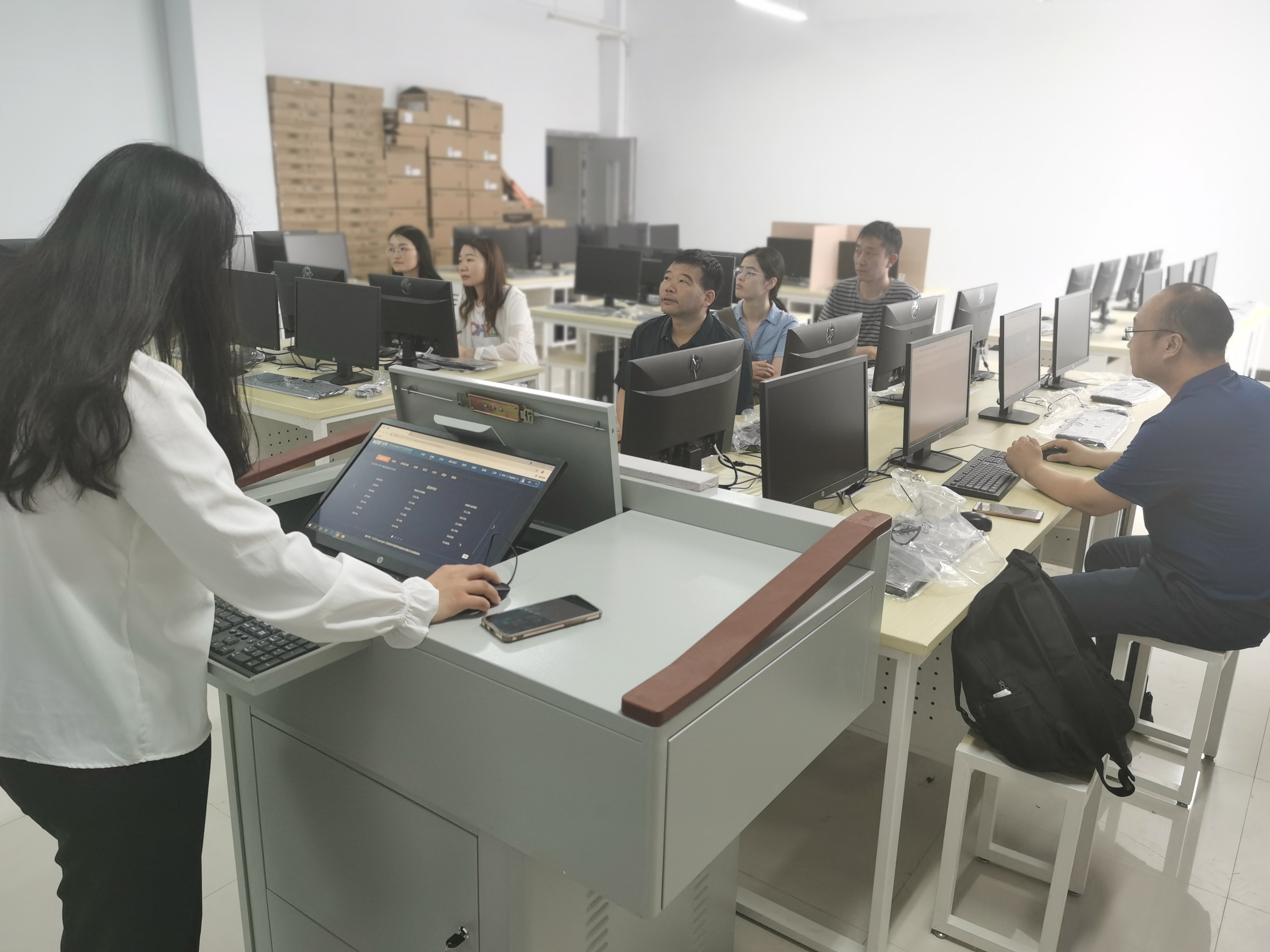 河南新世纪拓普电子技术有限公司产品部经理武北方等人对物流1+X考证基地建设项目软硬件的使用进行了讲解,并对各位教师的问题一一进行解答,物流管理专业各位教师也按照培训指导进行了实际操作。通过学习,提高了物流管理专业教师对新设备的使用和维护的能力。