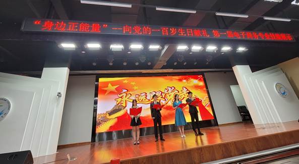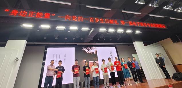 为了给同学们一个更好的自我展示平台,号召学生学习身边正能量,5月28日18:30,国际工商学院电商专业在校综合楼B座演播厅举办“身边的正能量”――向党的一百岁生日献礼暨第一届电子商务专业技能展示及颁奖晚会。国际工商学院院长孙权、党总支书记张鹏、团总支书记谢锡莹出席活动,电商教研室主任陈丽娟,金艳、郭薇、吴丹华、葛秀丽、孙文霞等专业老师、辅导员及电商专业100余名学生参加活动。