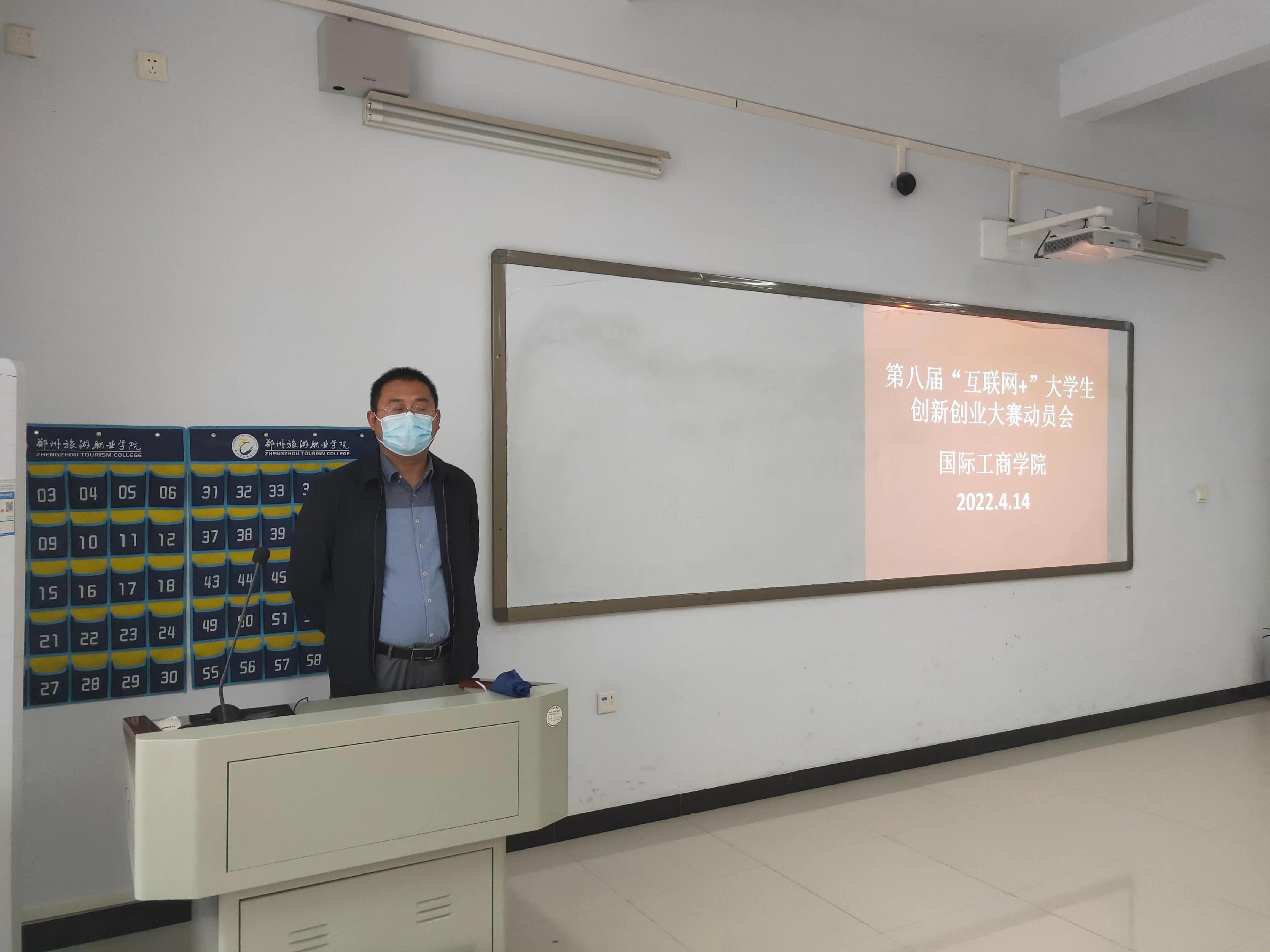 4月14日,国际工商学院在1B203教室召开第八届“互联网+”大学生创新创业大赛动员会。会议由戴鹏老师主持,孙权院长出席并讲话,我院在校各班班长参加会议。