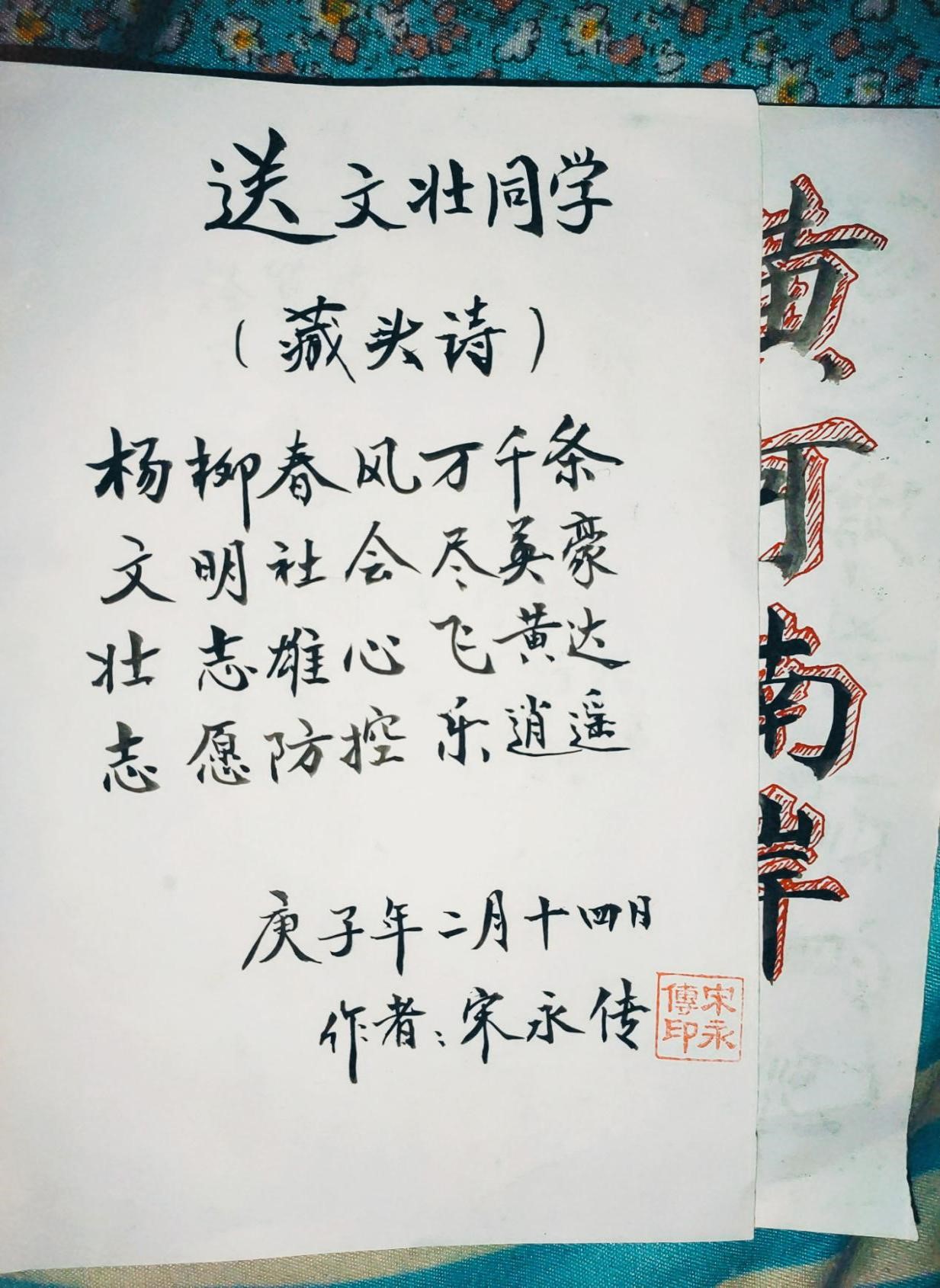 书法爱好者宋老师为杨文壮同学书写的藏头诗