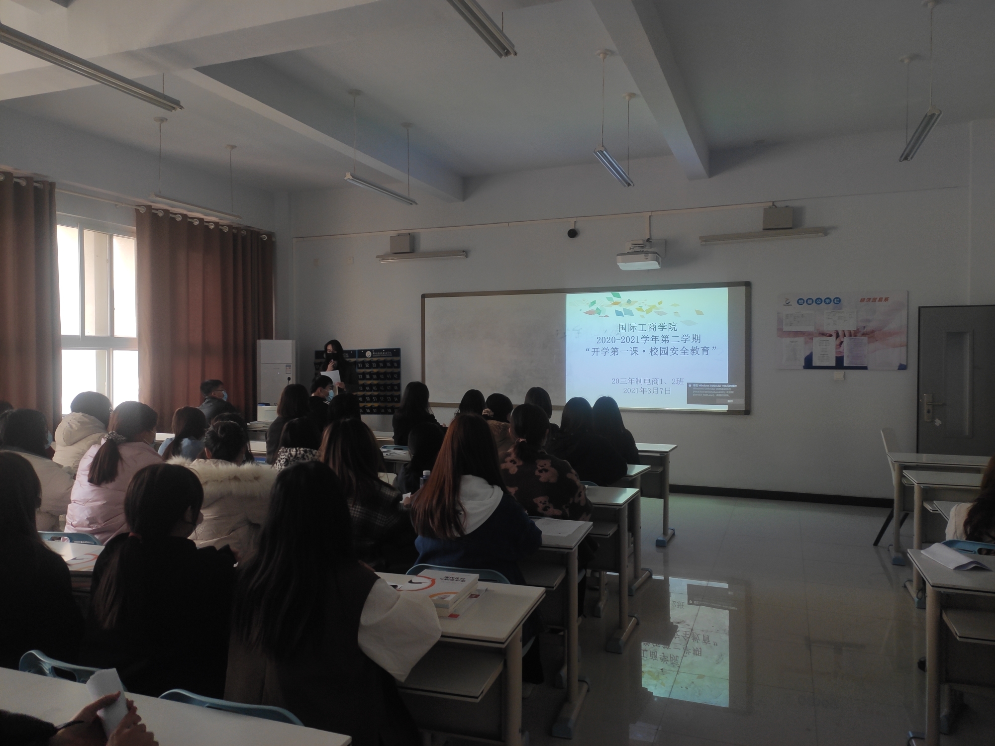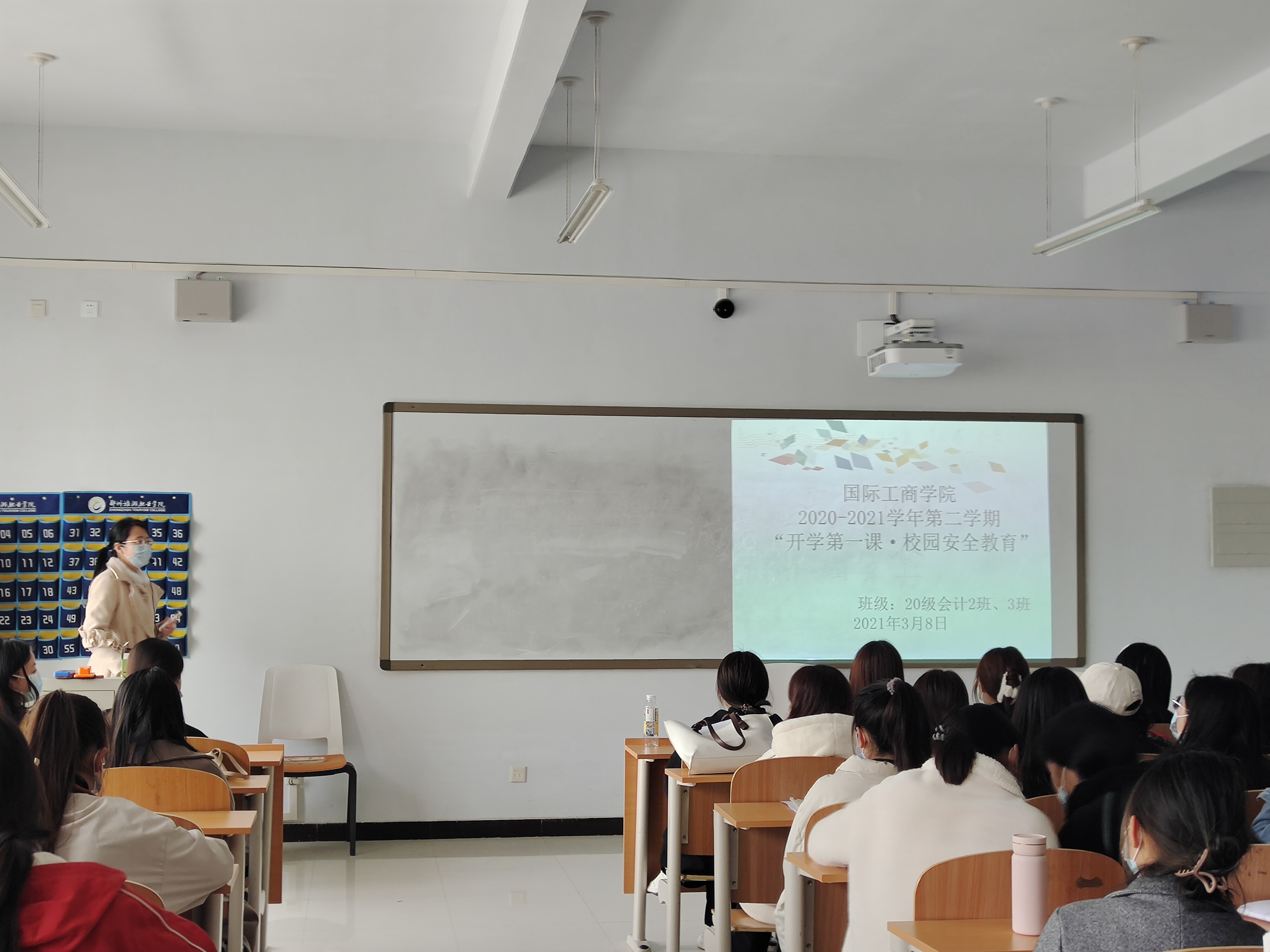 3月7日-3月8日,国际工商学院组织全体在校班级于1B教学楼5-6楼分班召开开学第一课暨校园安全班会,班会由各班主任主持召开。