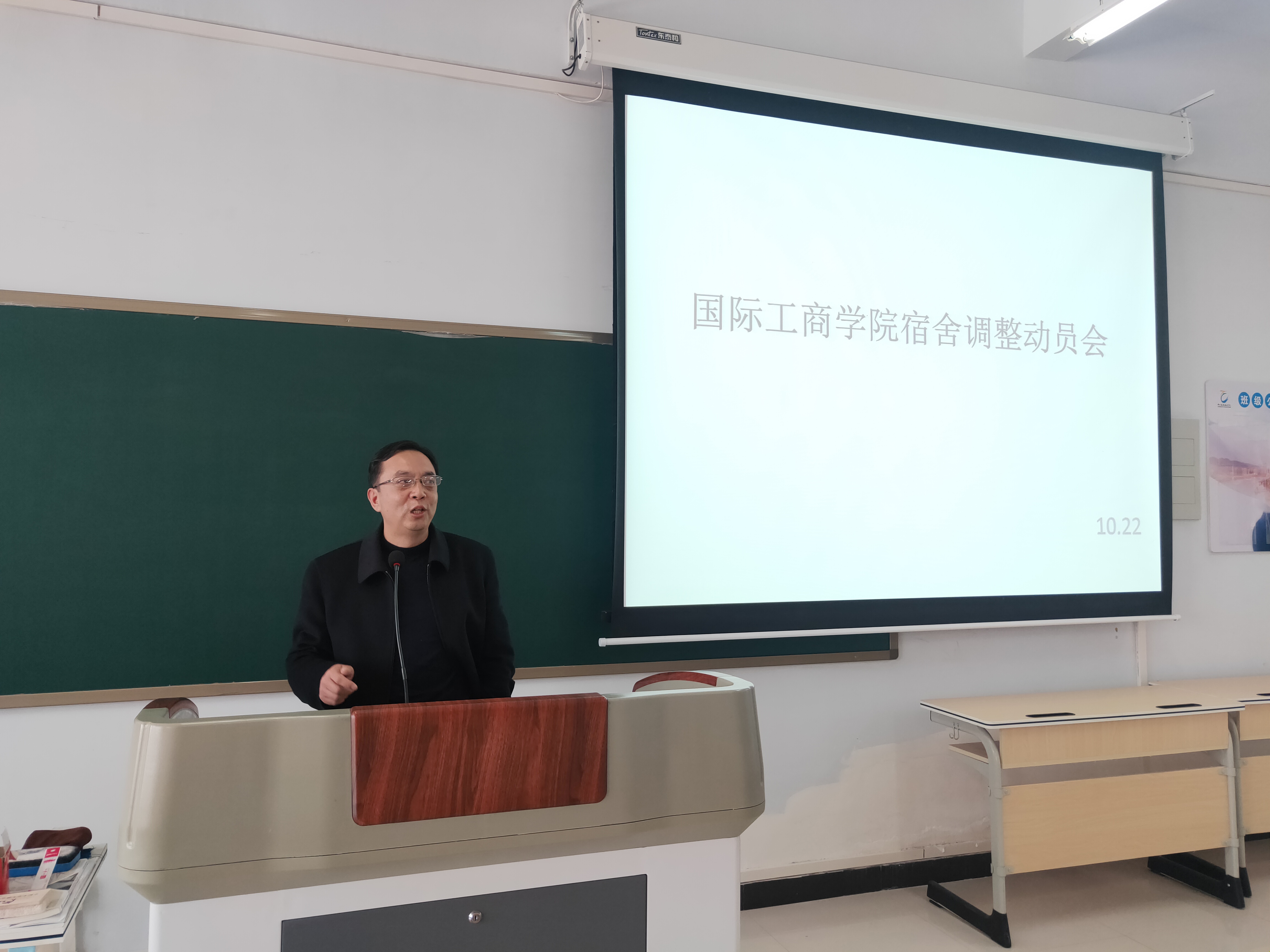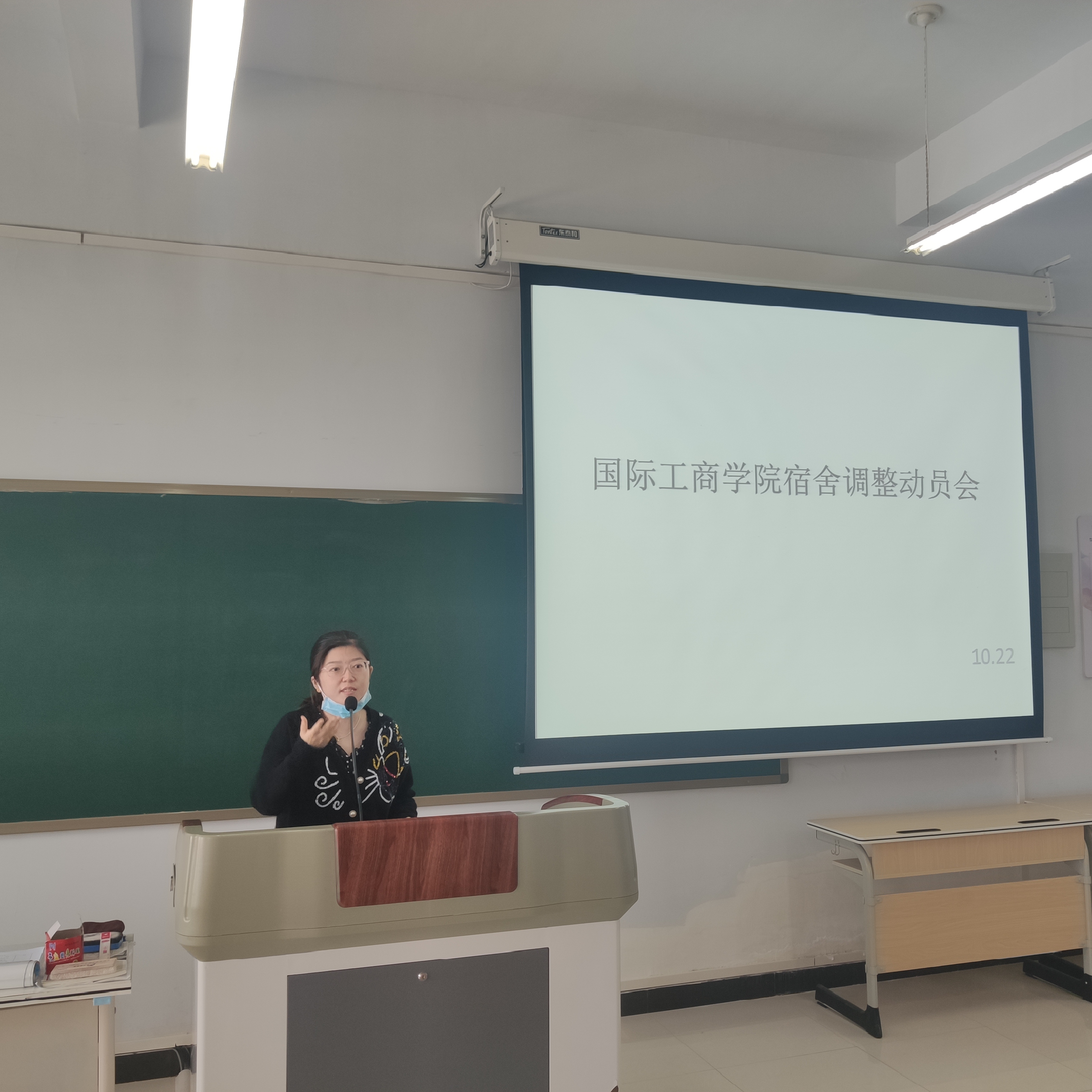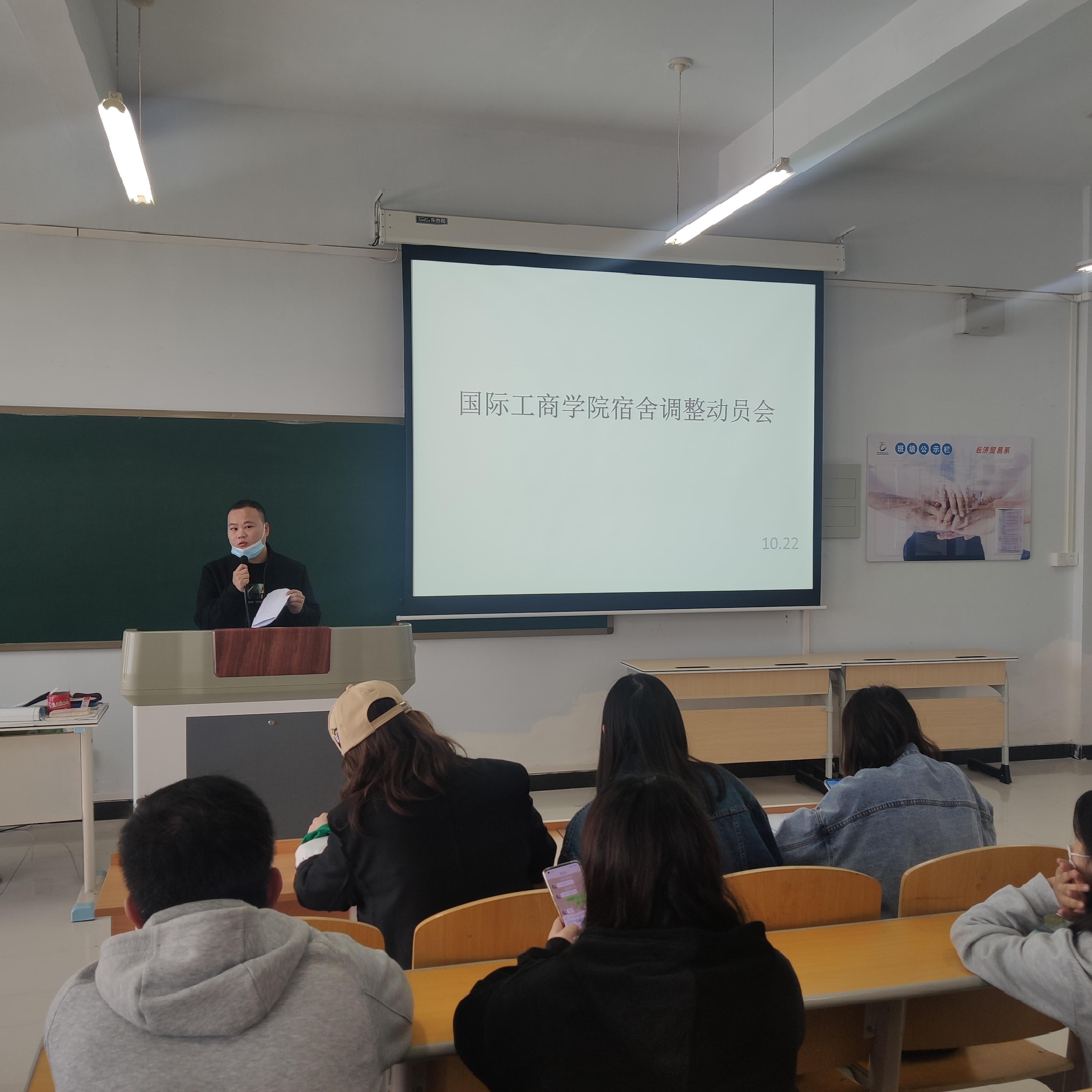 随着6号公寓楼的投入使用,为配合学校宿舍调整工作,10月22日12:00,国际工商学院在1B教学楼602教室召开宿舍调整动员会,会议由国际工商学院团总支书记谢锡莹主持,党总支书记张鹏出席会议,宿舍管理负责老师张权、部分辅导员老师、生活部学生干事、涉及宿舍调整的学生参加会议。