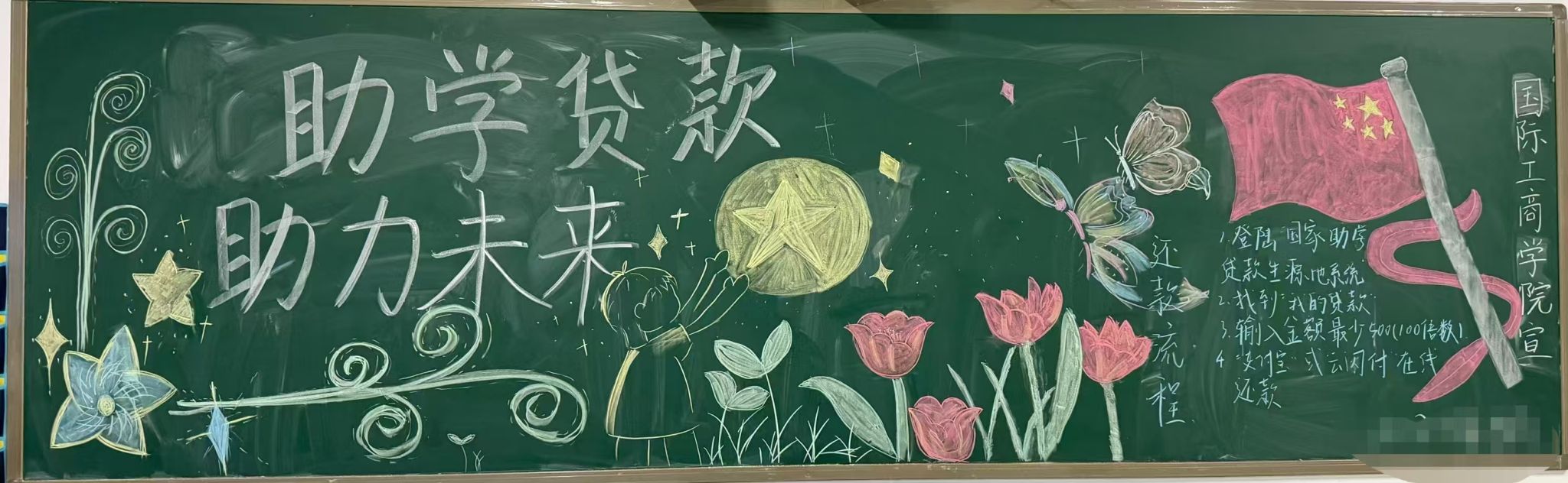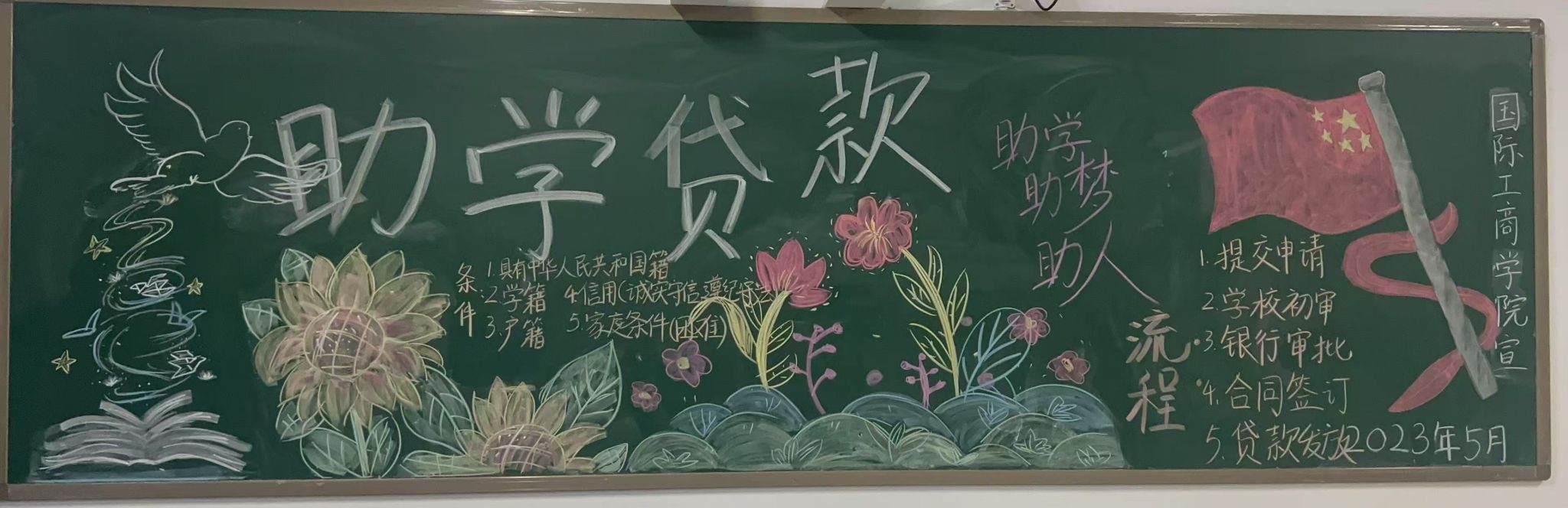 为帮助家庭经济困难学生顺利完成学业,国际工商学院近日通过校园黑板报专题宣传的形式,向学生普及国家助学贷款政策,打通教育惠民政策落地的"最后一公里"。