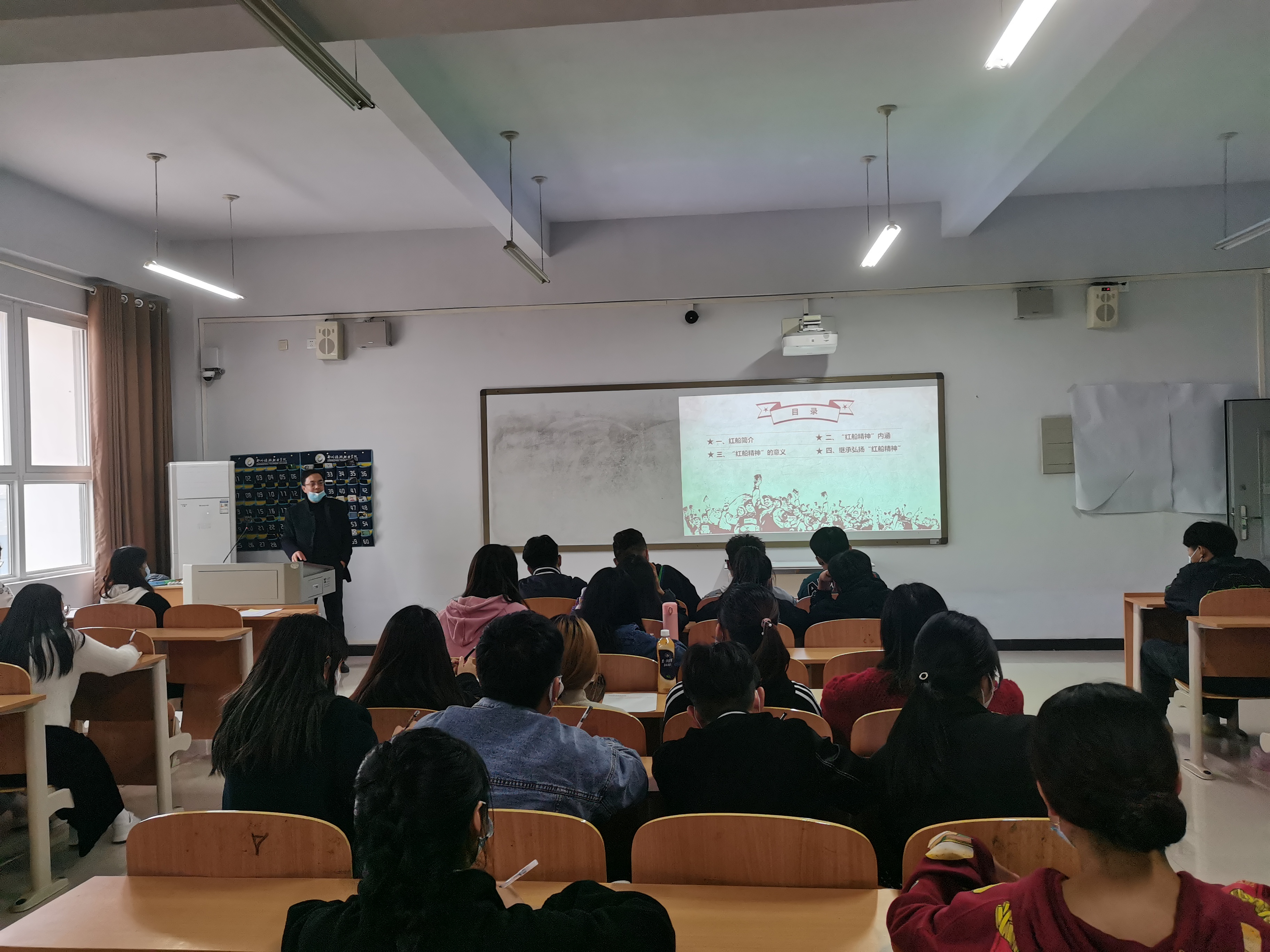 接着,张鹏通过电视剧《觉醒年代》为大家讲述了党的艰苦卓绝的奋斗历程,让我们学习和了解了党的发展史。最后,张鹏详细讲解了“红船精神”的内涵和意义以及“红船精神”的现实价值,使同学们懂得了“红船精神”就是:开天辟地、敢为人先的首创精神,坚定理想、百折不挠的奋斗精神,立党为公、忠诚为民的奉献精神。这精神是我们党的精神瑰宝,是我们共产党人奋斗的初心。