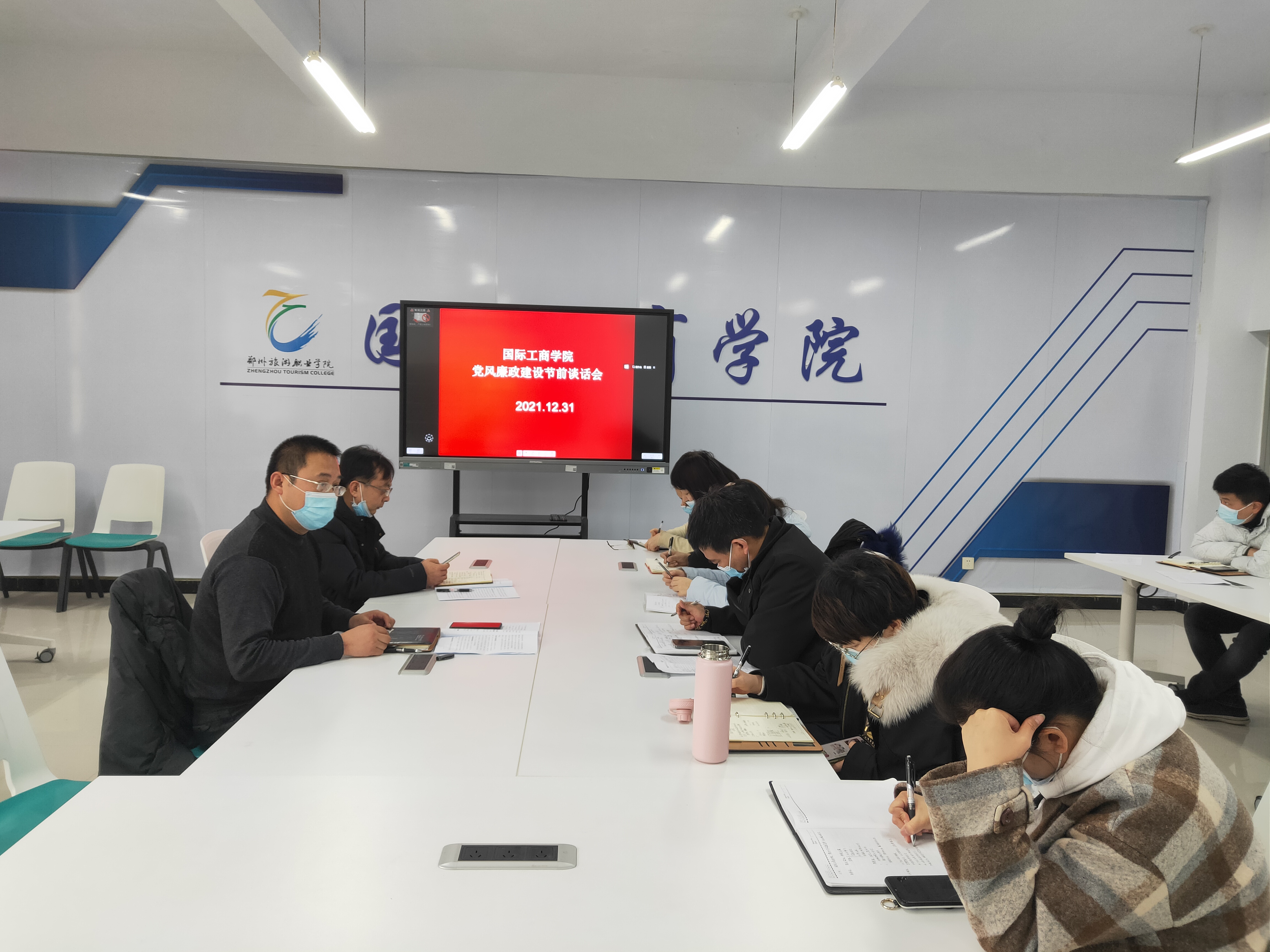 元旦、春节将至,为进一步做好党风廉政建设工作,严明纪律要求,持续巩固深化作风建设成果,确保全院广大教职工风清气正、廉洁祥和过节,12月31日,国际工商学院在1B304会议室召开党风廉政建设节前谈话会。会议由国际工商学院党总支书记张鹏主持。国际工商学院学院院长孙权、副院长郭崖、全体党员干部、教职工参会。