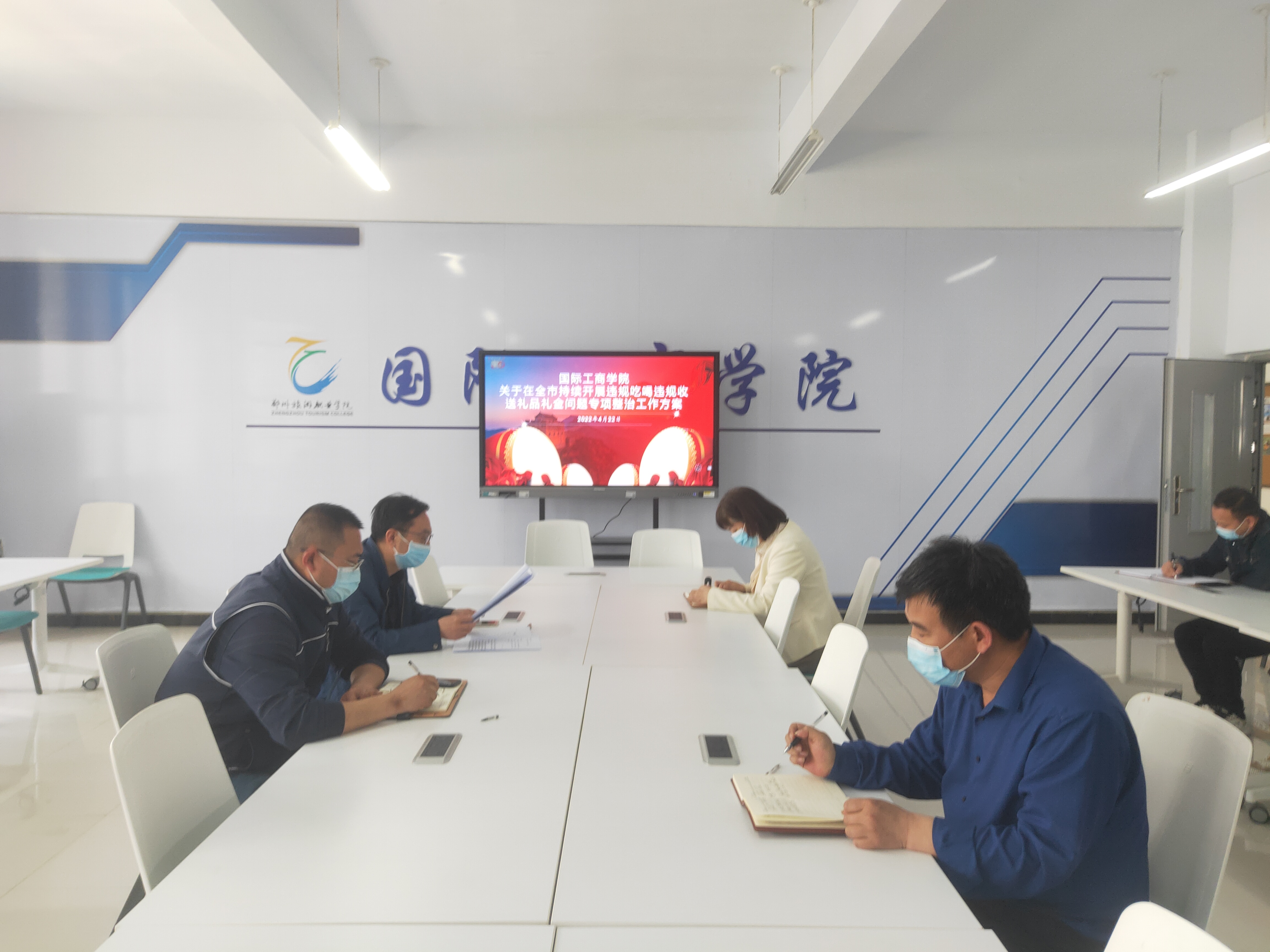 4月23日,国际工商学院在1B304会议室召开《关于在全市持续开展违规吃喝违规收送礼品礼金问题专项整治工作方案》专题会议。会议由国际工商学院党总支书记张鹏主持,孙权院长、郭崖副院长、全体教职工参加会议。