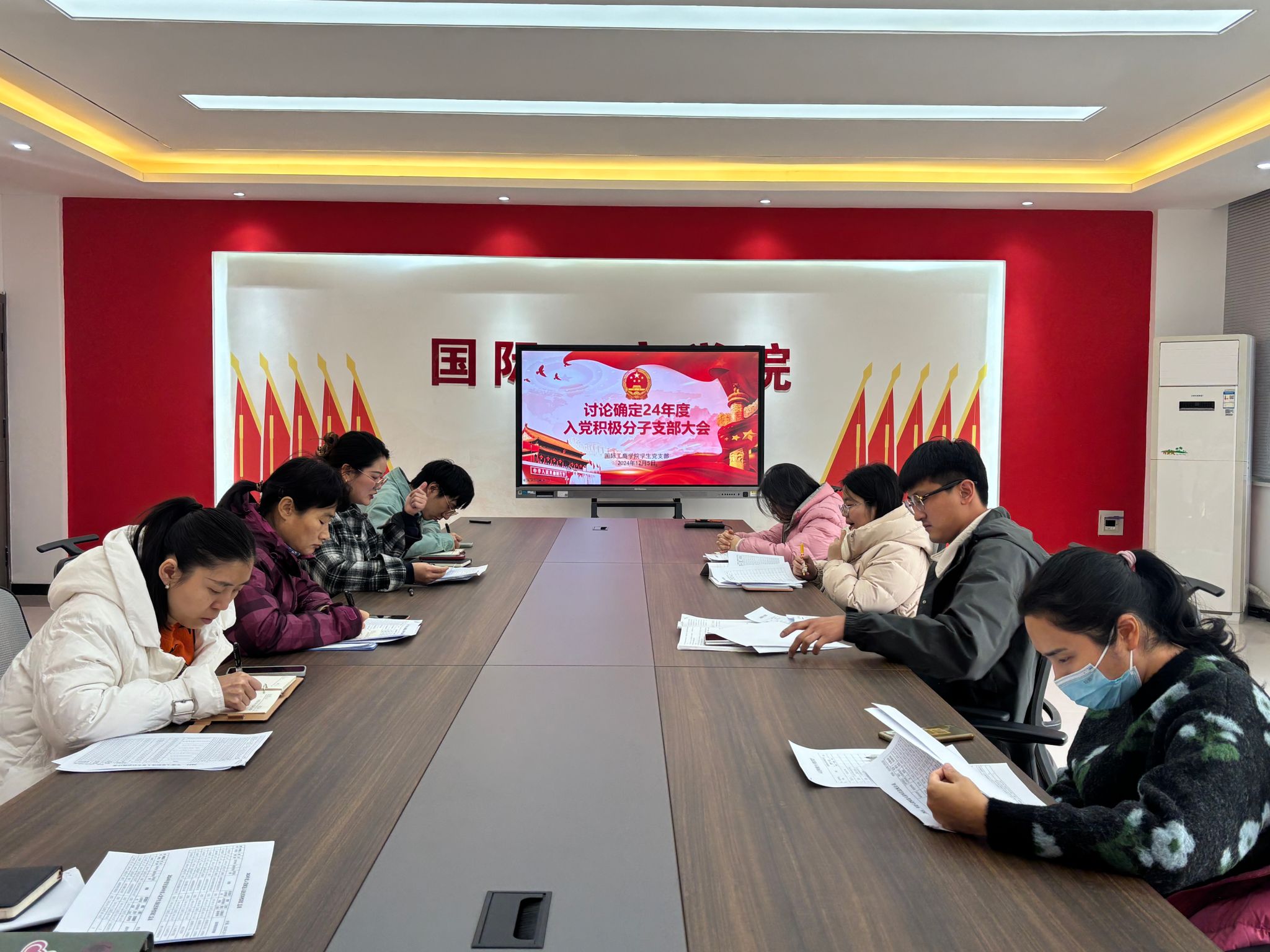 为进一步加强基层党组织建设,落实党支部发展党员工作,充实党的新生力量,国际工商学院学生党支部于2024年12月5日在1B303党建活动室召开支部全体党员会议,讨论确定庞阔等47名同志列为2024年度入党积极分子的相关事宜。本次会议由我院学生党支部书记葛秀丽主持,学生党支部全体党员参加。