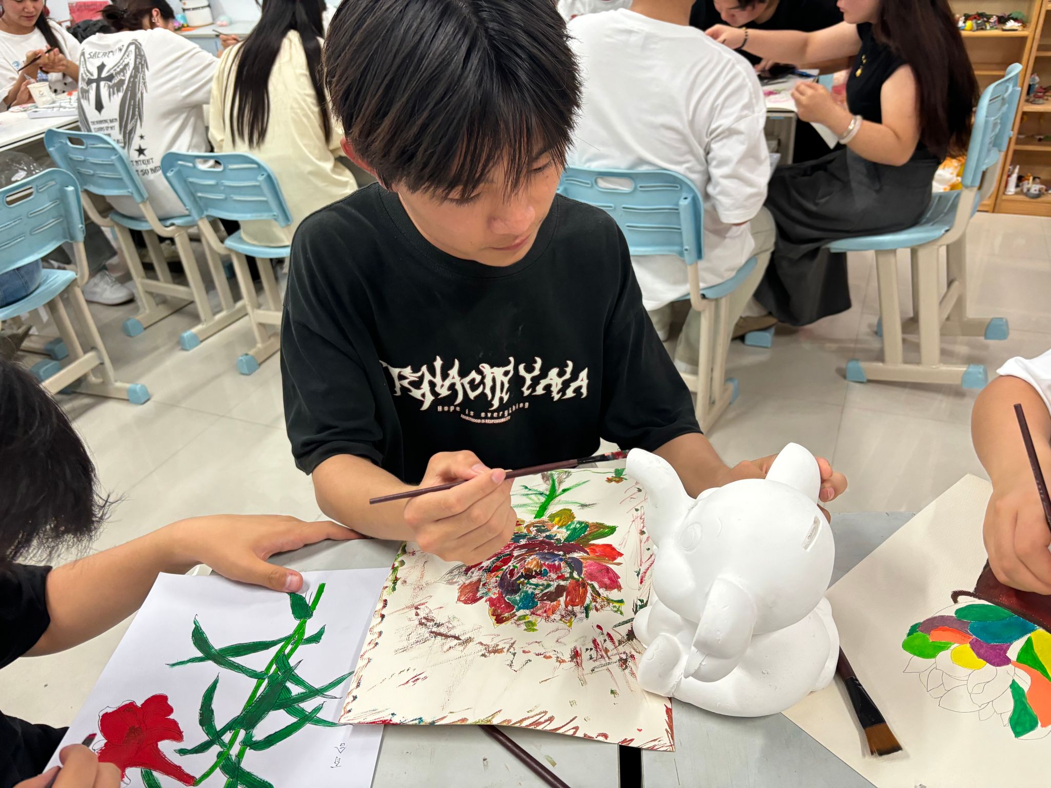 活动分为泥塑疗愈和彩绘体验两个环节。在心理咨询师的指导下,同学们用彩色塑造“情绪小怪兽”,并通过彩绘素胚陶偶展现内心世界。现场还设置了作品展览和分享环节,评选出“心灵巧手奖”“色彩疗愈奖”等奖项。参与者纷纷表示,活动不仅缓解了学业压力,更在创作中获得了成就感与快乐。