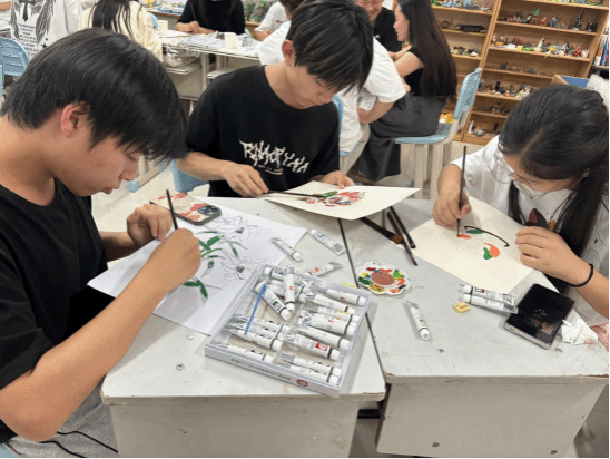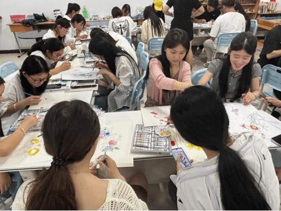 活动精心设计了国画水彩画涂色工作坊,通过分层体验满足不同学生的需求:新手区提供简笔画模板和基础颜料包;进阶区配备专业绘画工具;治愈区则创新性地引入"情绪色彩卡",引导学生通过色彩表达情感。活动特别邀请专业教师现场讲解色彩心理学原理,帮助学生理解色彩与情绪的关系。新增的"快闪涂鸦"环节,让学生在音乐节奏中即兴创作,现场气氛热烈活跃。
