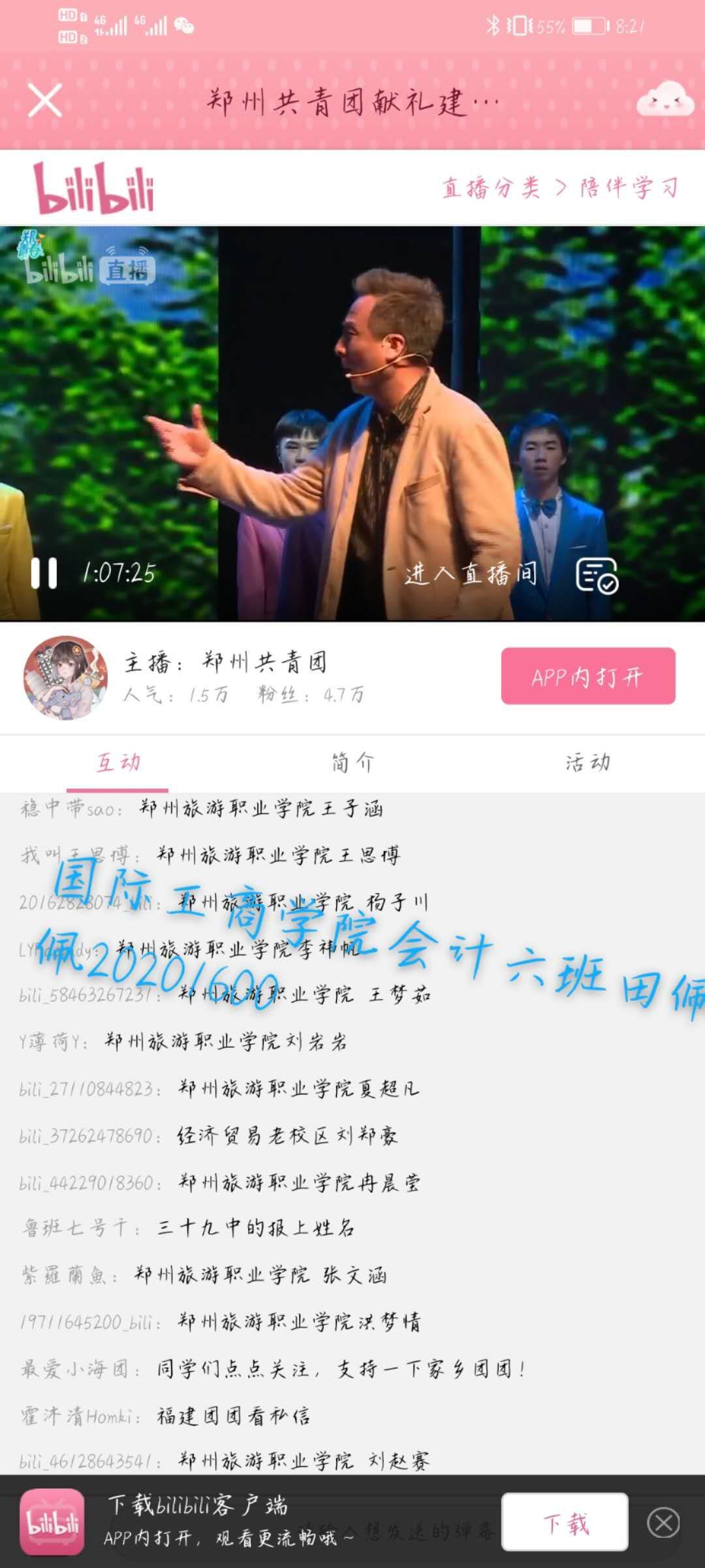 为庆祝五四青年节,迎接党的百年华诞,贯彻落实团中央“学党史、强信念、跟党走”主题教育实践要求。2021年5月4日晚上19:30—21:00,国际工商学院组织全体同学线上观看郑州共青团“不忘初心担使命 砥砺奋进‘郑’青春”--2021年郑州共青团献礼建党百年暨五四主题团日活动在郑州共青团b站平台的直播。