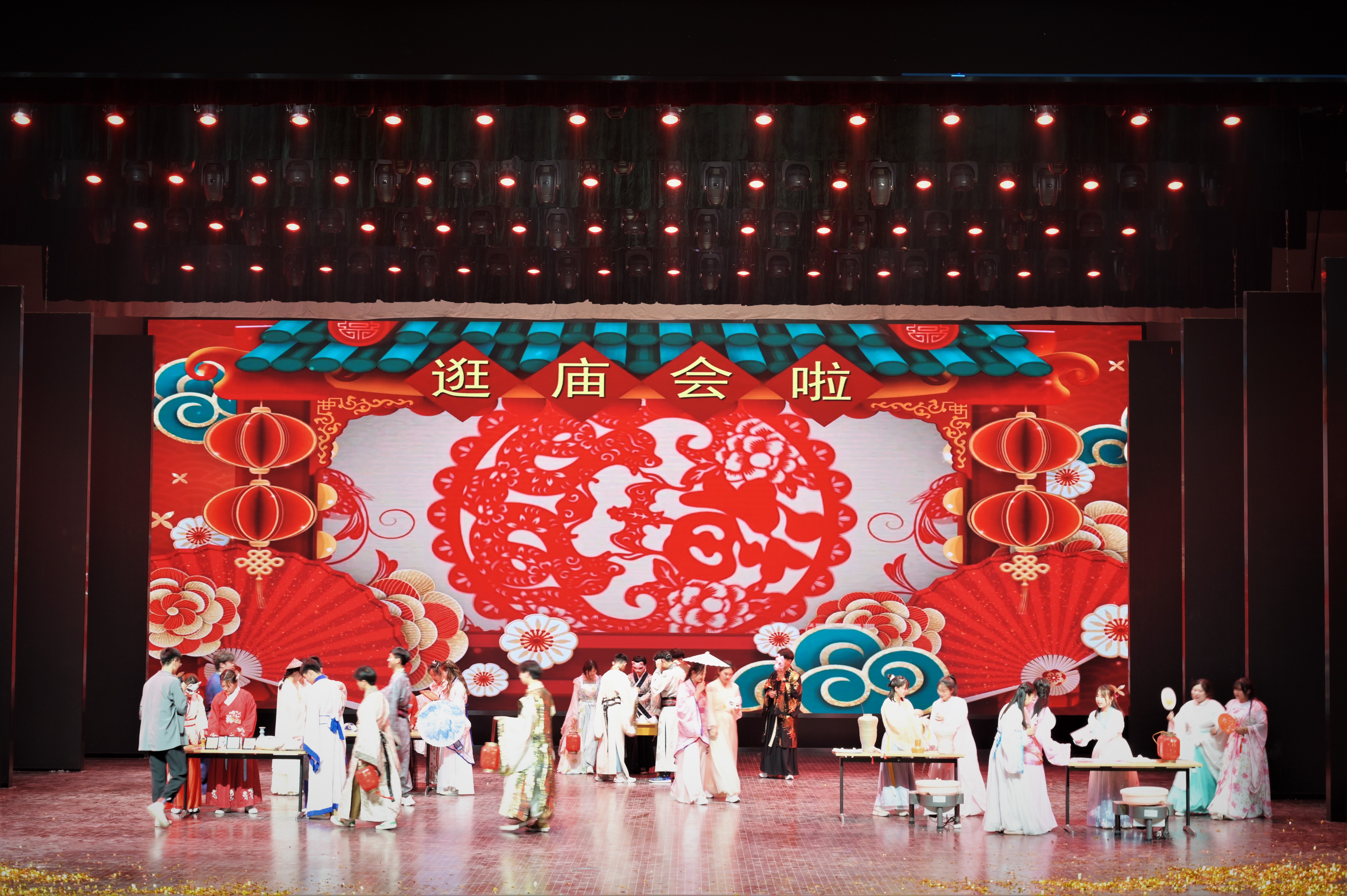 我院的《逛庙会》以传统文化艺术为展点,现场演绎剪纸、泥塑、木刻等传统技艺,以逛庙会的形式演出专业特色,增强了大家对学院专业的了解。整个表演既充满传统文化色彩,又富有学生的青春活力,充分展现了学生的才艺,促进了学生的全面发展。