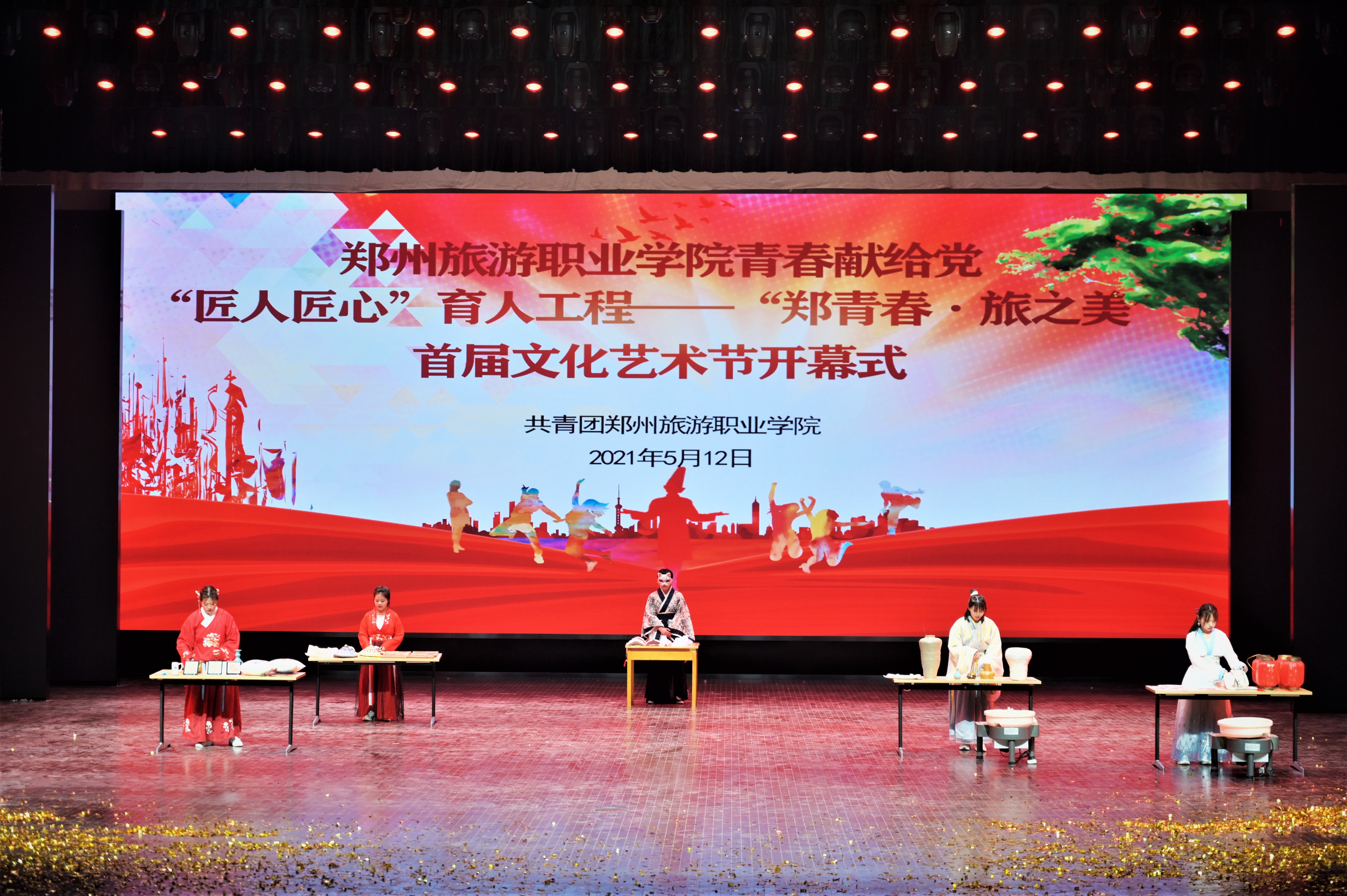 为了丰富校园文化生活,促进学生个性全面发展,向学生提供一个展示才华的舞台,5月12日15:00,pp电子游戏平台网站“郑青春 旅之美”首届文化艺术节开幕式在文化艺术中心举行。我院作品《逛庙会》作为专业技能展示在开幕式上表演。