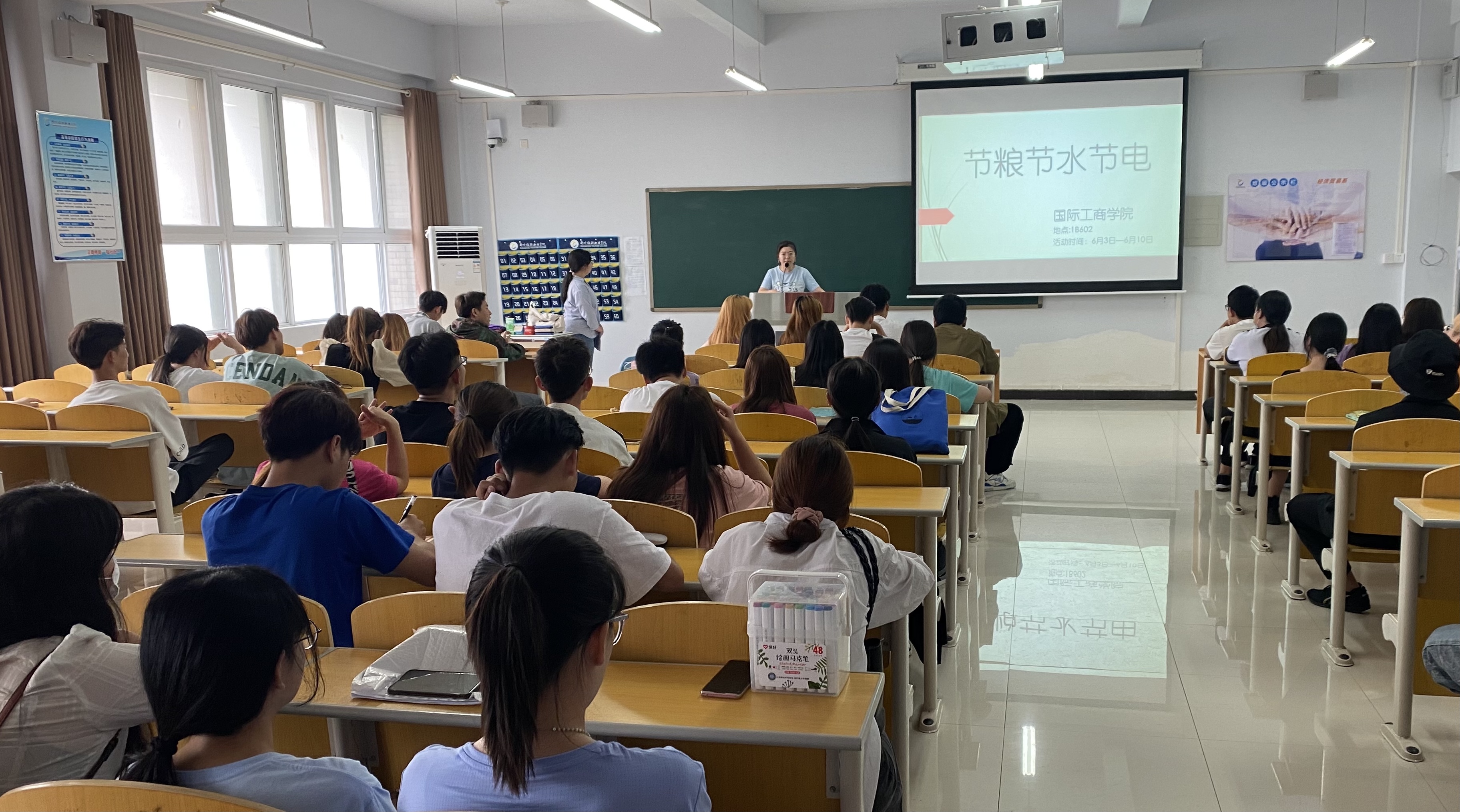 为了培养学生节水、节电、节粮的意识,推进节约型校园建设,树立学生节约光荣、浪费可耻的意识,国际工商学院于6月3日在1B602教室召开“节粮、节水、节电”活动动员会,国际工商学院团总支书记谢锡莹主持会议并讲话,辅导员闫晗、辅导员李冰、在校班级全体班长参加会议。