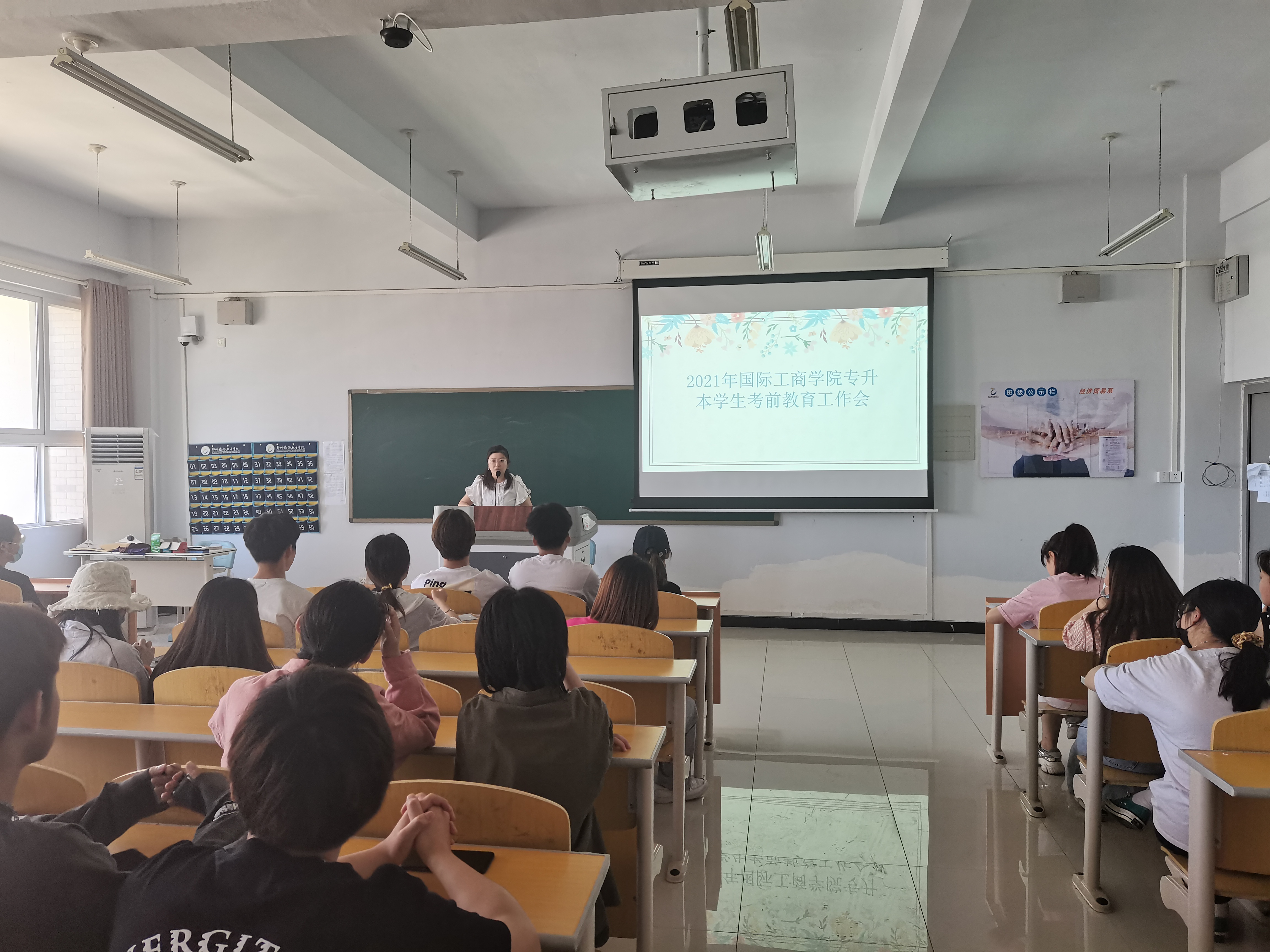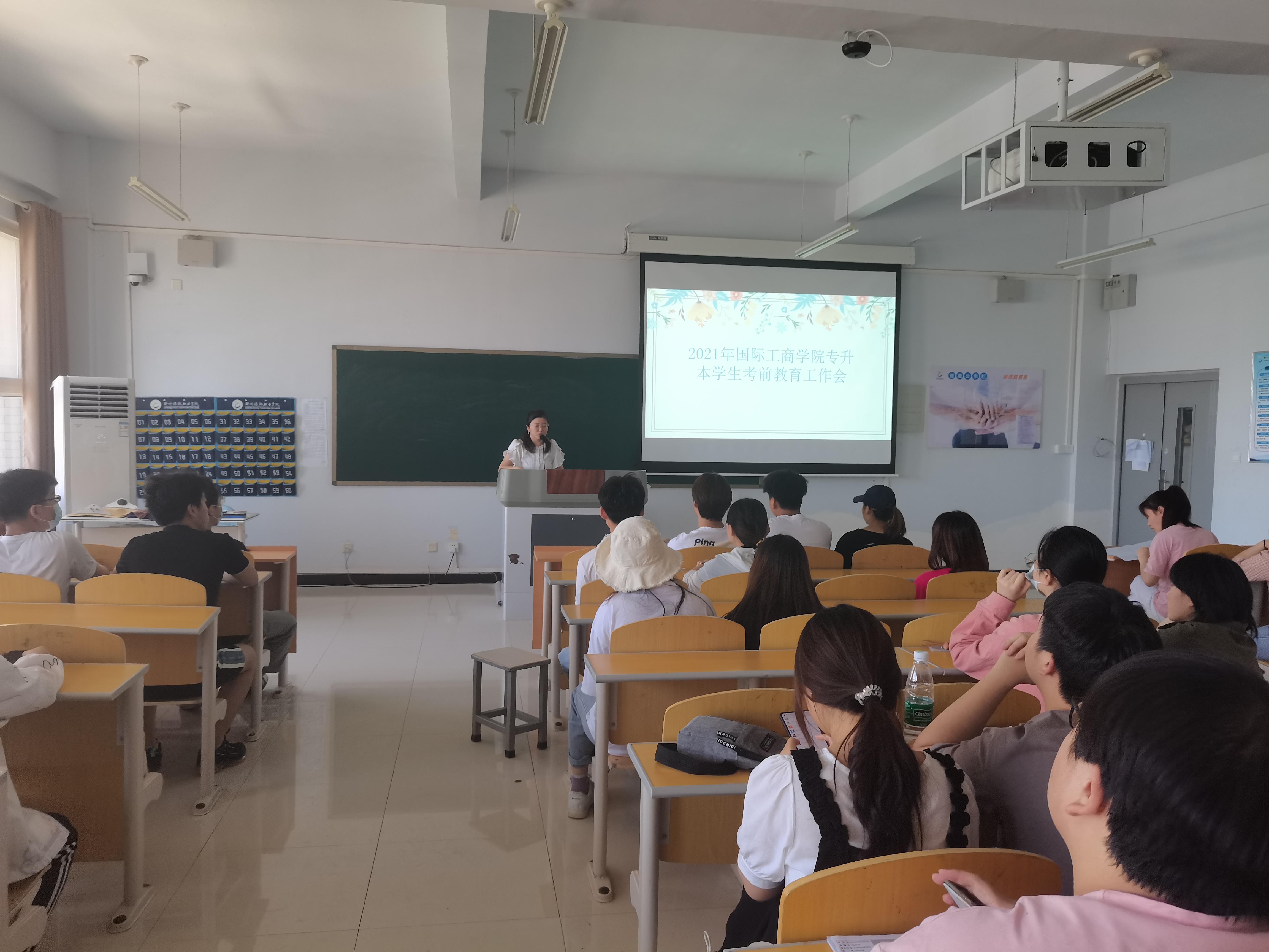 2021年6月4日中午11:30,国际工商学院在1B602教室举办2021年专升本学生考前教育工作会。国际工商学院专升本学生参加了此次会议,会议由团总支书记谢锡莹主持。