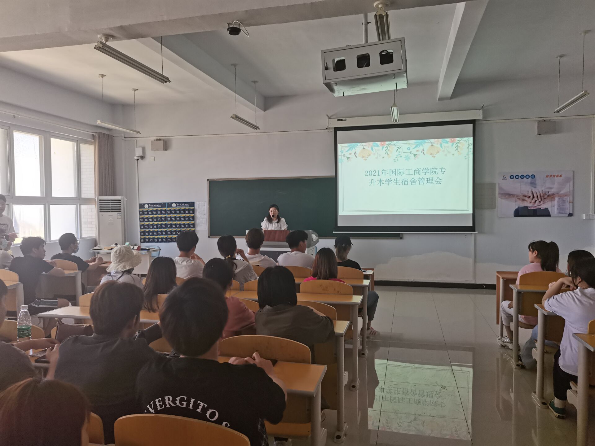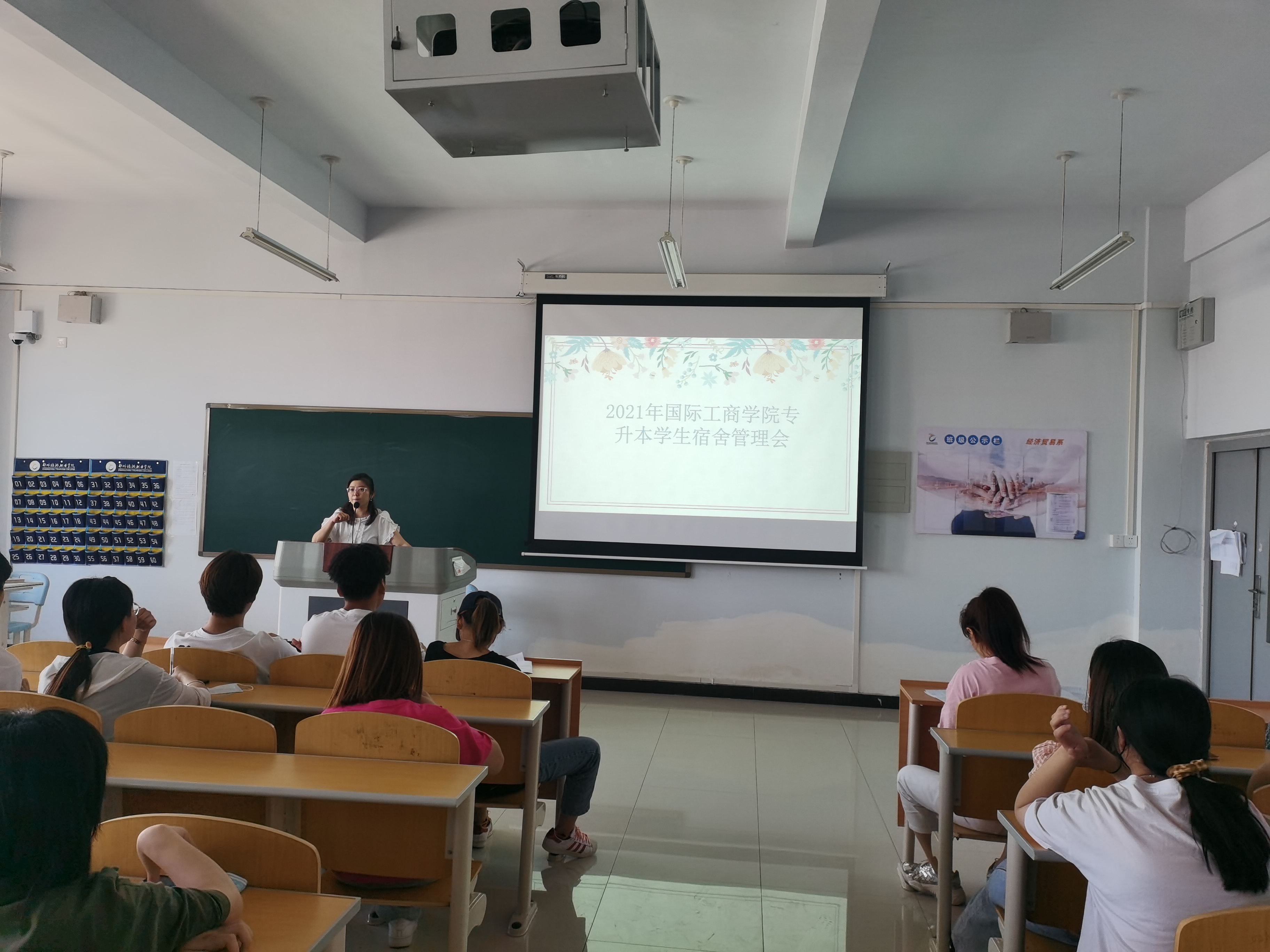 6月4日11:30,国际工商学院在1B602教室召开2021年专升本返校学生宿舍管理会。团总支书记谢锡莹主持会议并讲话,国际工商学院专升本返校学生参加会议。