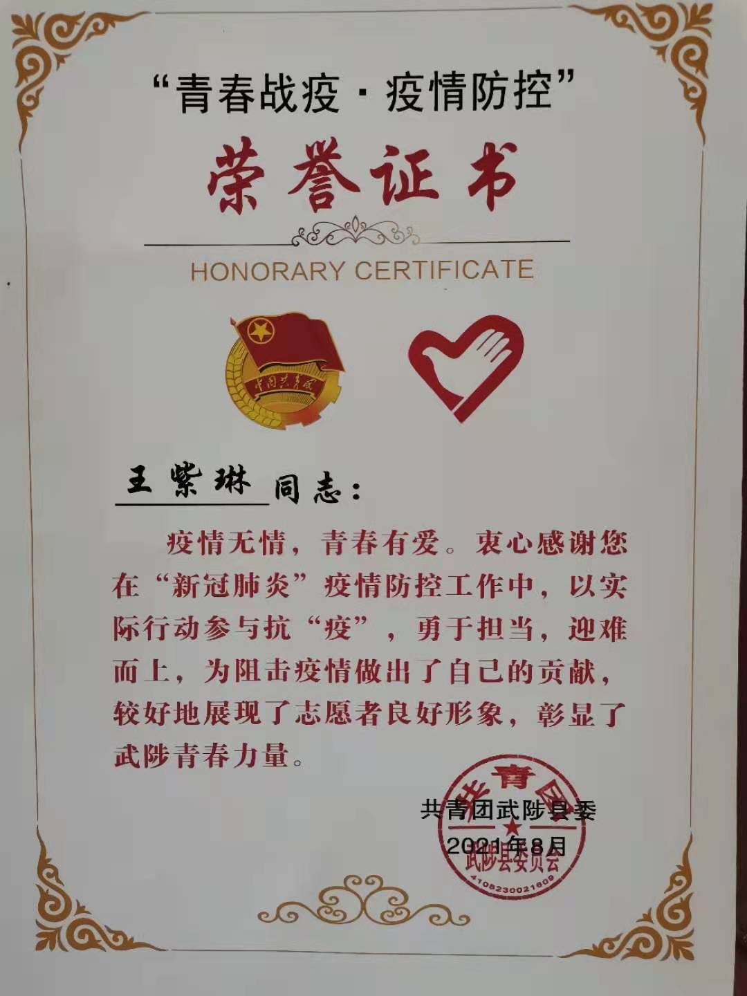 我是20级会计五班的王紫琳,新一轮疫情来袭,作为新时代大学生应该为抗击疫情贡献自己的一份力量。“我们社区疫情防控卡点志愿者太少,请求支援。”当看到这条请求支援的信息后,我毫不犹豫地报了名。我主要负责监管小区外来人员,做好登记,坚决阻止病毒携带者进入社区。疫情不散,我们不撤。我相信有那么多的志愿者、那么多勇于奉献的人,这场疫情我们一定可以取得最终的胜利。