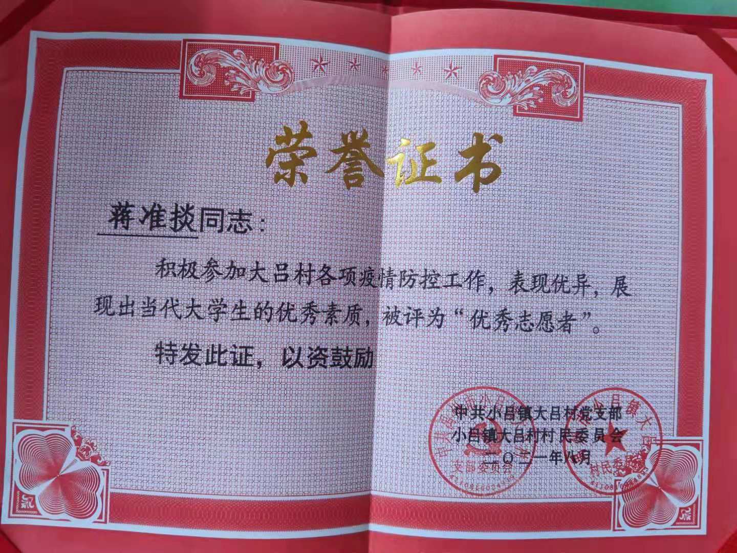 20级会计三班蒋准掞,8月12日至8月20日在禹州市小吕镇大吕村村委会做防疫志愿者。在防控期间,他严格按照流程开展工作,做来往车辆登记和测量体温工作,严格防控,决不懈怠。他说:“在国家和人民需要我们的时候,做出无怨无悔的选择,用行动书写人生华丽的篇章。”