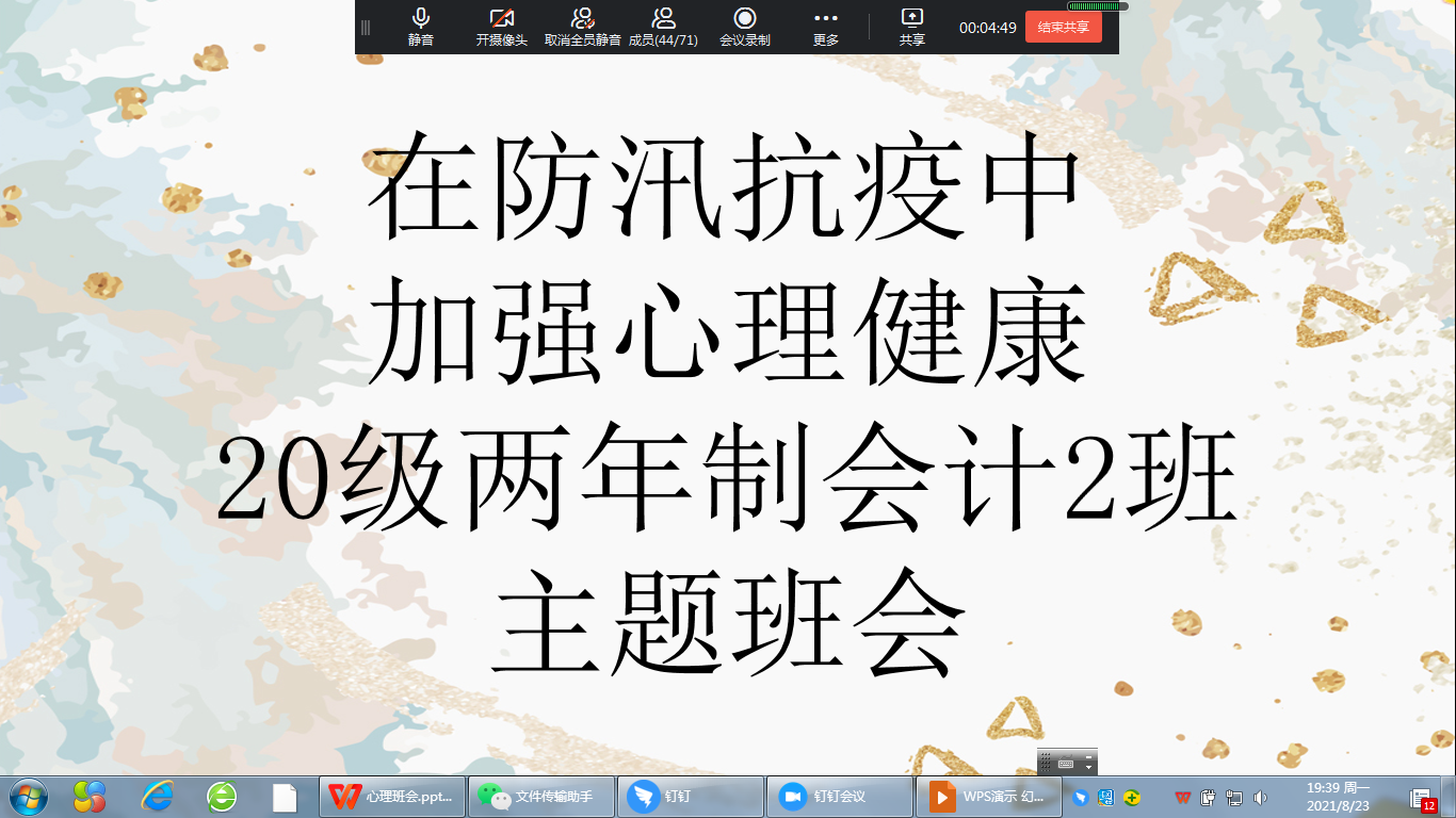 为帮助大学生调试身心状态,以良好心态面对洪灾及疫情带来的紧张、担忧和长期居家的不自在感,国际工商学院二级心理辅导站积极响应学生处号召,全院各班于8月16-24日召开了心理健康教育主题班会,摸排学生心理,提供心理帮扶,筑牢防汛抗疫心理防线。