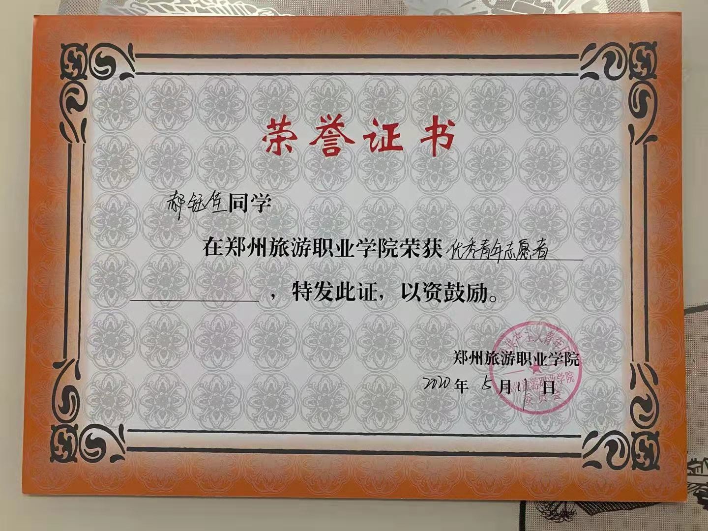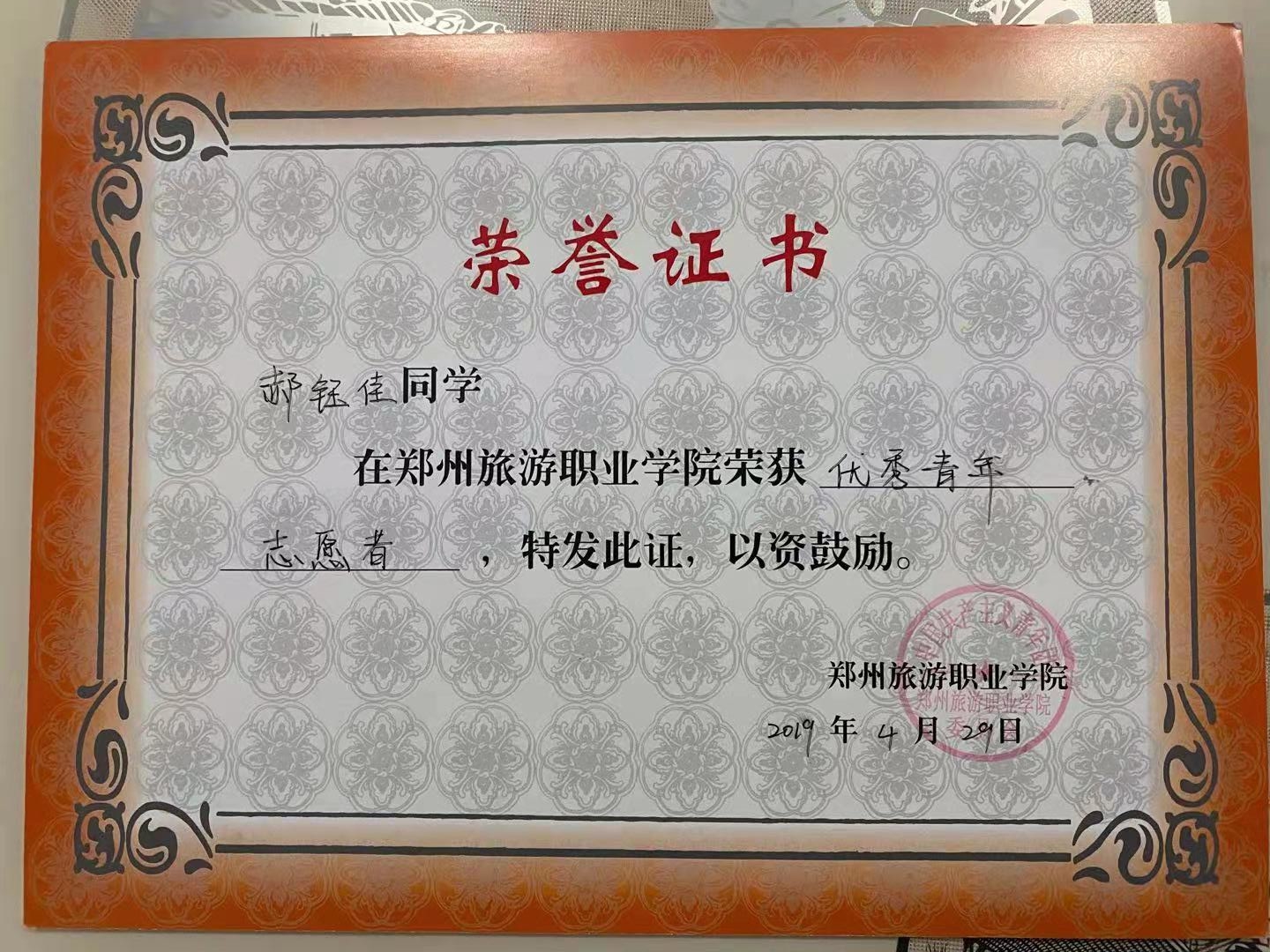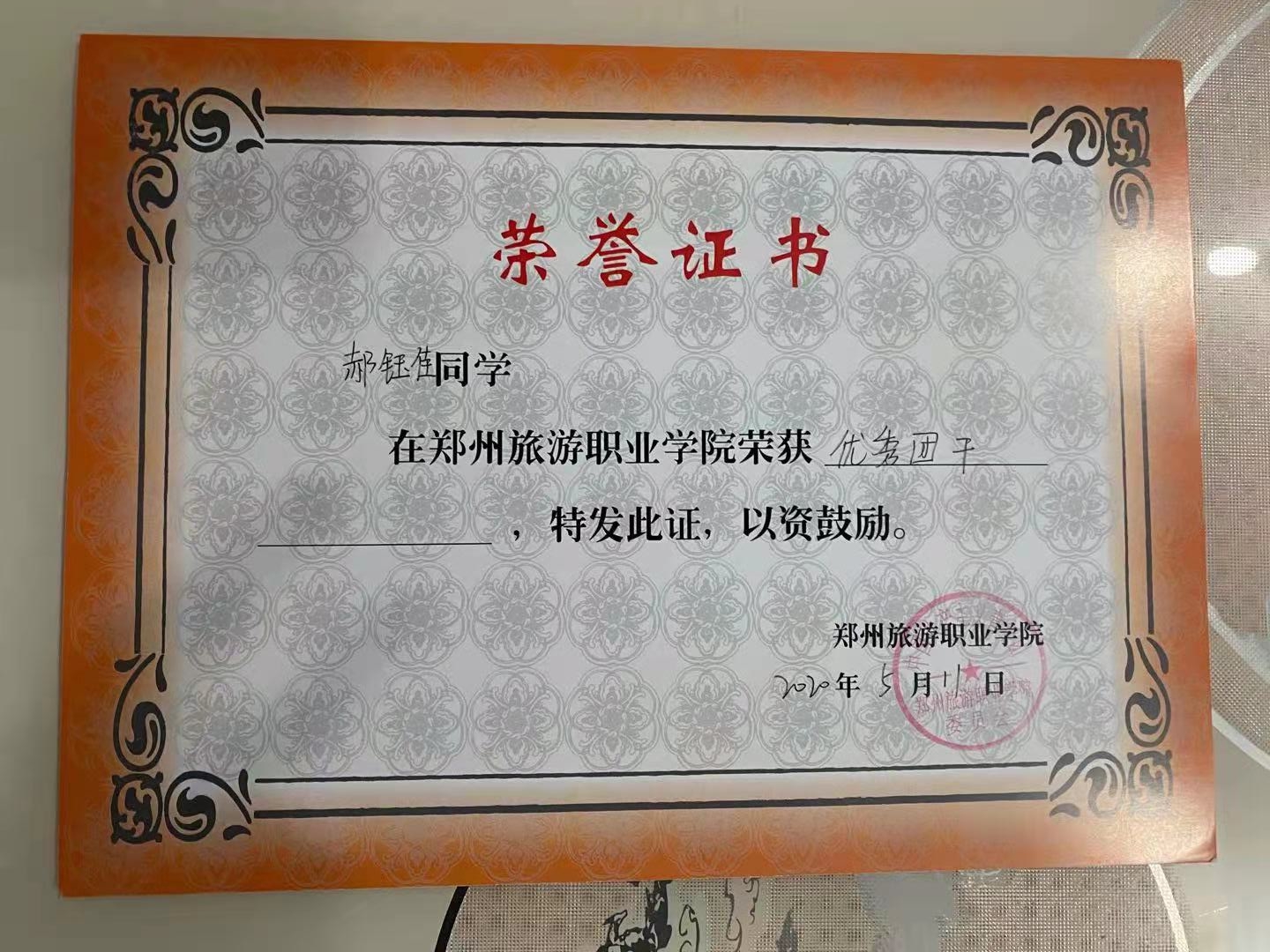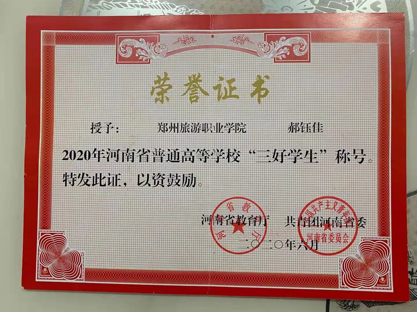 在校期间,郝钰佳同学思想端正,态度积极,表现优异,曾荣获国家励志奖学金、河南省三好学生、校三好学生、优秀青年志愿者、优秀团干、优秀学生干部等荣誉称号等。郝钰佳同学积极参与学校举行的活动,并作为学生主要负责人、领队,帮助老师组织并带领了学生们参加达人秀、一·二九大合唱、元旦晚会、青马工程培训、郑开国际马拉松志愿者、以及暑期三下乡社会实践等活动,不断提高个人的社会实践能力。