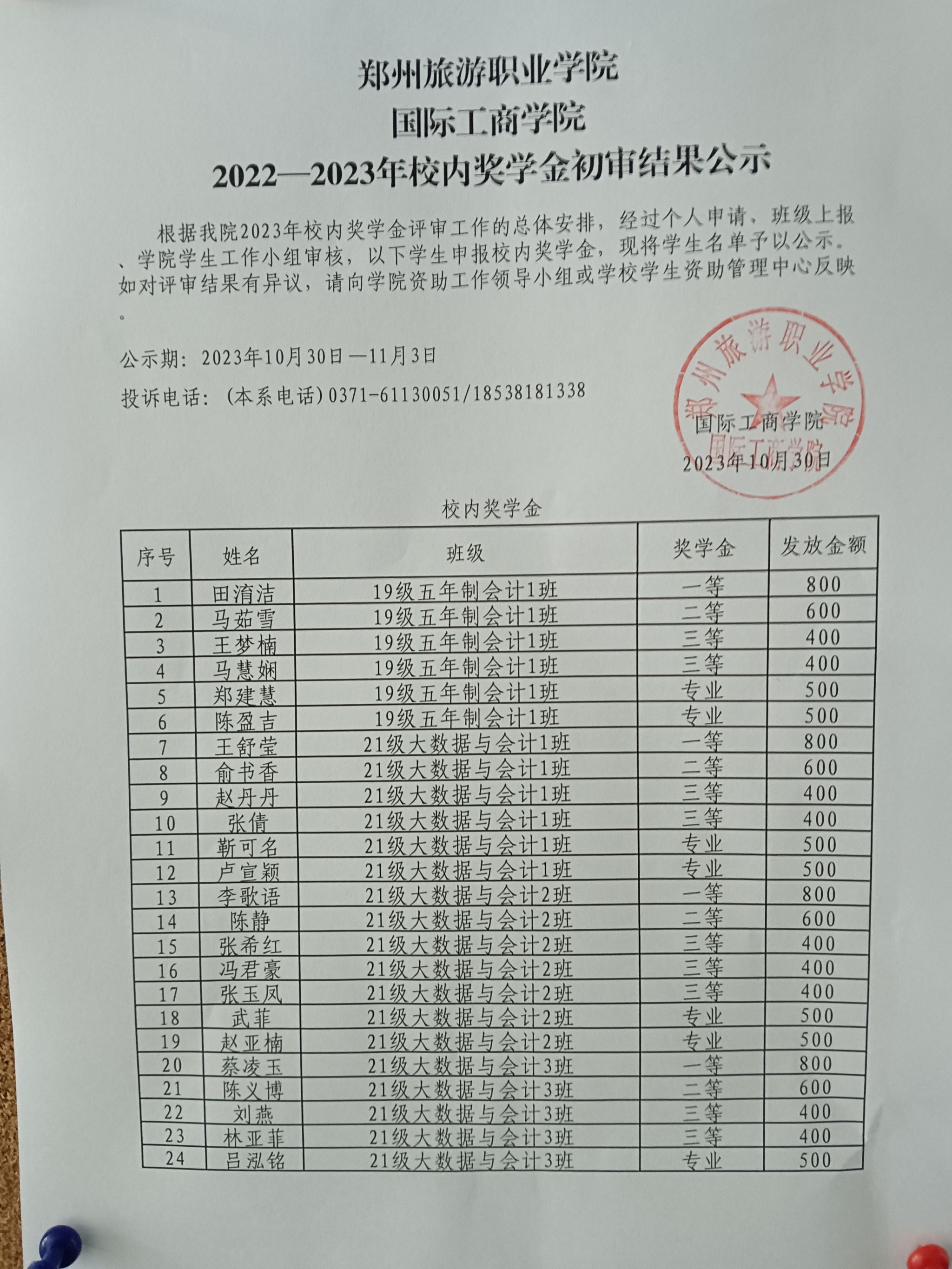 根据我院2023年国家奖助学金评审工作的总体安排,经过个人申请、班级上报、学院学生工作小组审核,以下学生申报校内奖学金,现将学生名单予以公示。