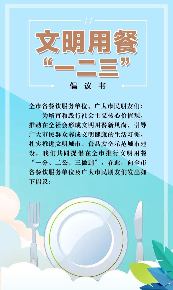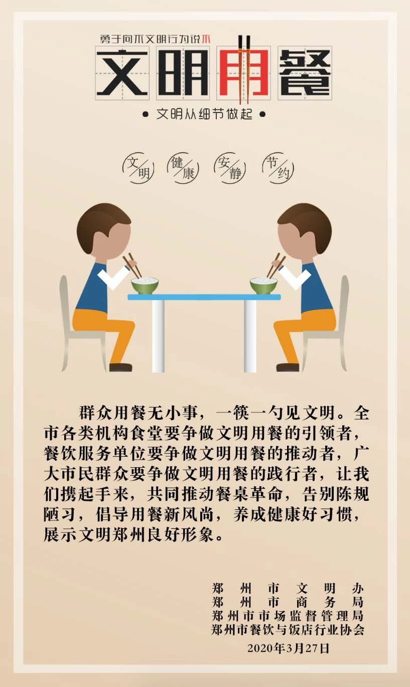 为大力培育和践行社会主义核心价值观,推动在全社会形成文明用餐新风尚,引导广大餐饮服务单位和市民群众自觉践行《郑州市文明用餐“一二三”倡议书》、养成文明健康的生活习惯,近日,郑州市文明办、郑州市商务局、郑州市市场监管局、郑州市餐饮与饭店行业协会联合制定并印发了《郑州市餐饮服务单位公筷公勺使用操作指南(试行)》。