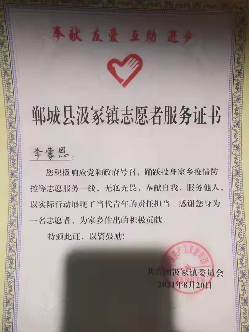 我是21级现代物流管理1班的李蒙恩。在2021年夏天我参加了疫情防控的志愿活动。作为志愿者工作,是我这一生中不可多得的宝贵经历。