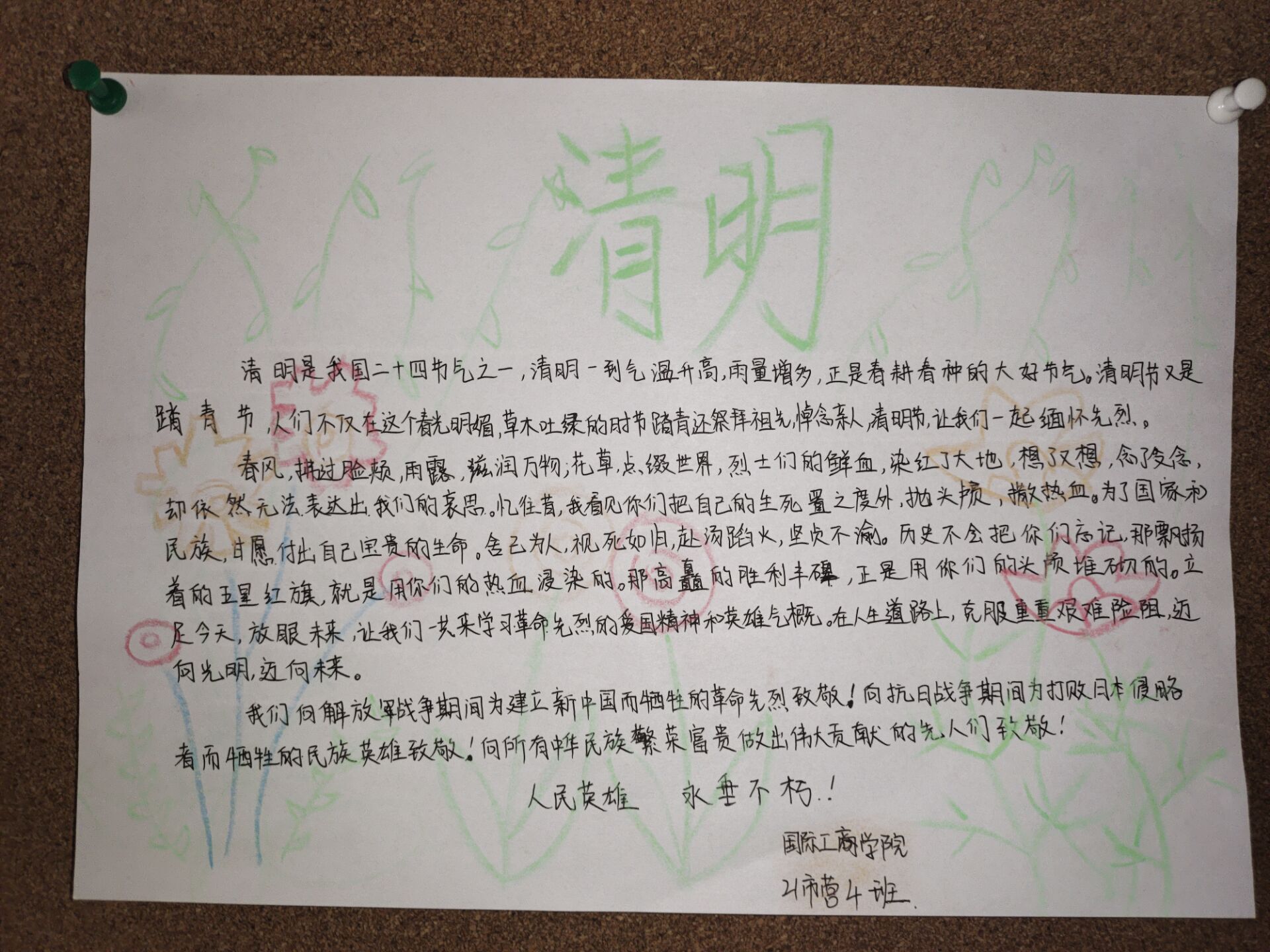 为了向同学们宣传文明祭祀,教育同学们缅怀先烈,表达对革命先烈们的深切敬意,国际工商学院在清明节日期间开展了清明节手抄报活动。