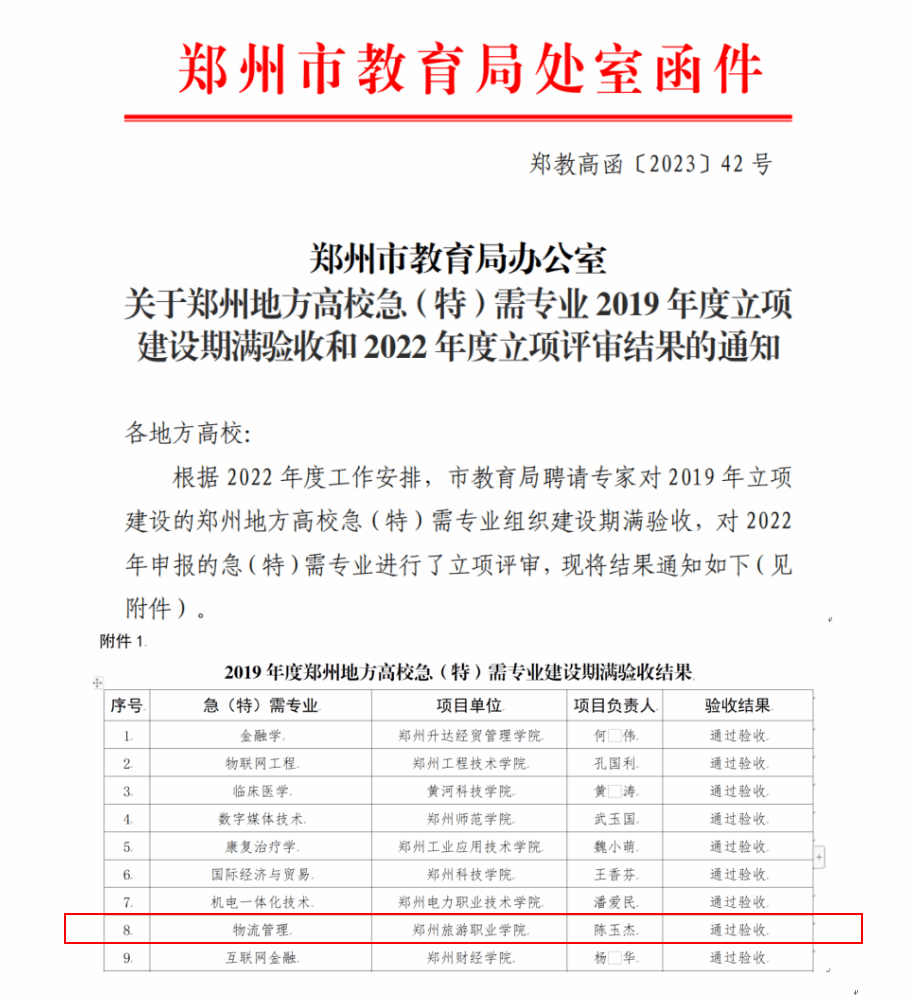 1月28日,郑州市教育局公布了《关于郑州地方高校急(特)需专业2019年度立项建设期满验收和2022年度立项评审结果的通知》(郑教高函[2023]42号)文件,pp电子物流管理专业顺利通过验收。
