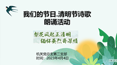 二是开展了诗词诵读活动,旨在缅怀先辈、弘扬传统。通过一首首诗词,寄托哀思,传递文明。朗诵会上大家将自己准备的诗词分享朗诵给大家,分别诵读了《清明》、《途中寒食》、《祭奠英雄》等优秀诗词作品。大家声情并茂,在独诵和合诵中抒发着真情实感,在诵读经典诗词的过程中对清明的含义有了更深入的了解。