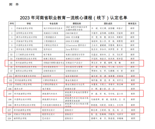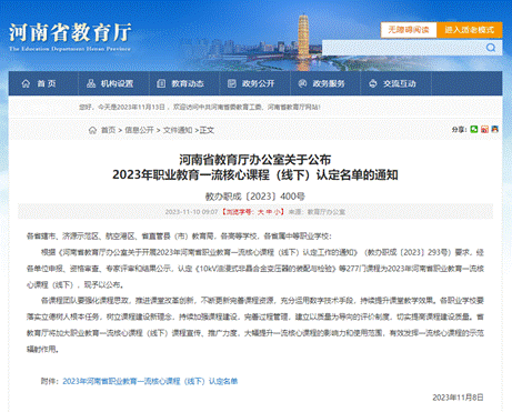 11月10日,省教育厅发布《河南省教育厅办公室关于公布2023年职业教育一流核心课程(线下)认定名单的通知》(教办职成〔2023〕400号),pp电子《定制旅行产品设计》《路由交换技术》《新能源汽车电池及管理系统检修》《招贴设计》4门课程获得批准。
