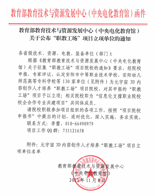 11月8日,教育部教育技术与资源发展中心公布了2023年“职教工场”项目的立项单位名单,pp电子成功入选并成为“信息化支撑职业院校校企合作专业共建项目”共同体成员,文化艺术学院申报的项目获批成为“元宇宙3D内容创作人才培养校企合作‘职教工场’”。