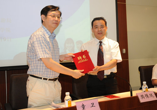 院长樊豫陇(右)向中国旅行社总社总裁童卫(左)颁发客座教授聘书