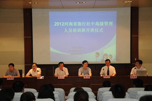 6月9日上午9时,2012年河南省旅行社中高级管理人员培训班开班仪式在我院信息中心一楼报告厅举行。来自全省各地市33家旅行社的77名学员参加了开班仪式。仪式由我院副院长张建军主持,河南省旅游局副局长王玉宝,中国国际旅行社总社总裁童卫,学院党委书记岳俊华、院长樊豫陇,河南省旅游局人教处处长张建州等与会。