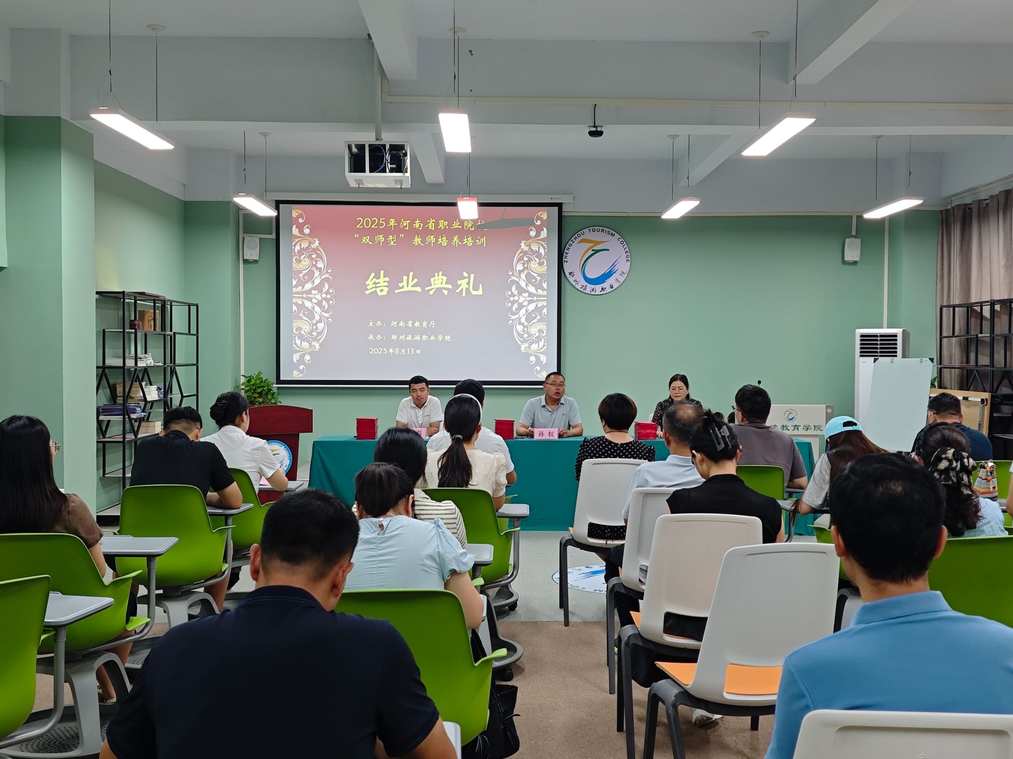 8月13日,由省教育厅主办、pp电子承办的河南省职业院校“双师型”教师培养培训班结业典礼在pp电子1A106培训教室举行。继续教育学院院长孙权、培训科科长张洁、班主任霍磊及参训教师出席结业典礼。结业典礼由张洁主持。