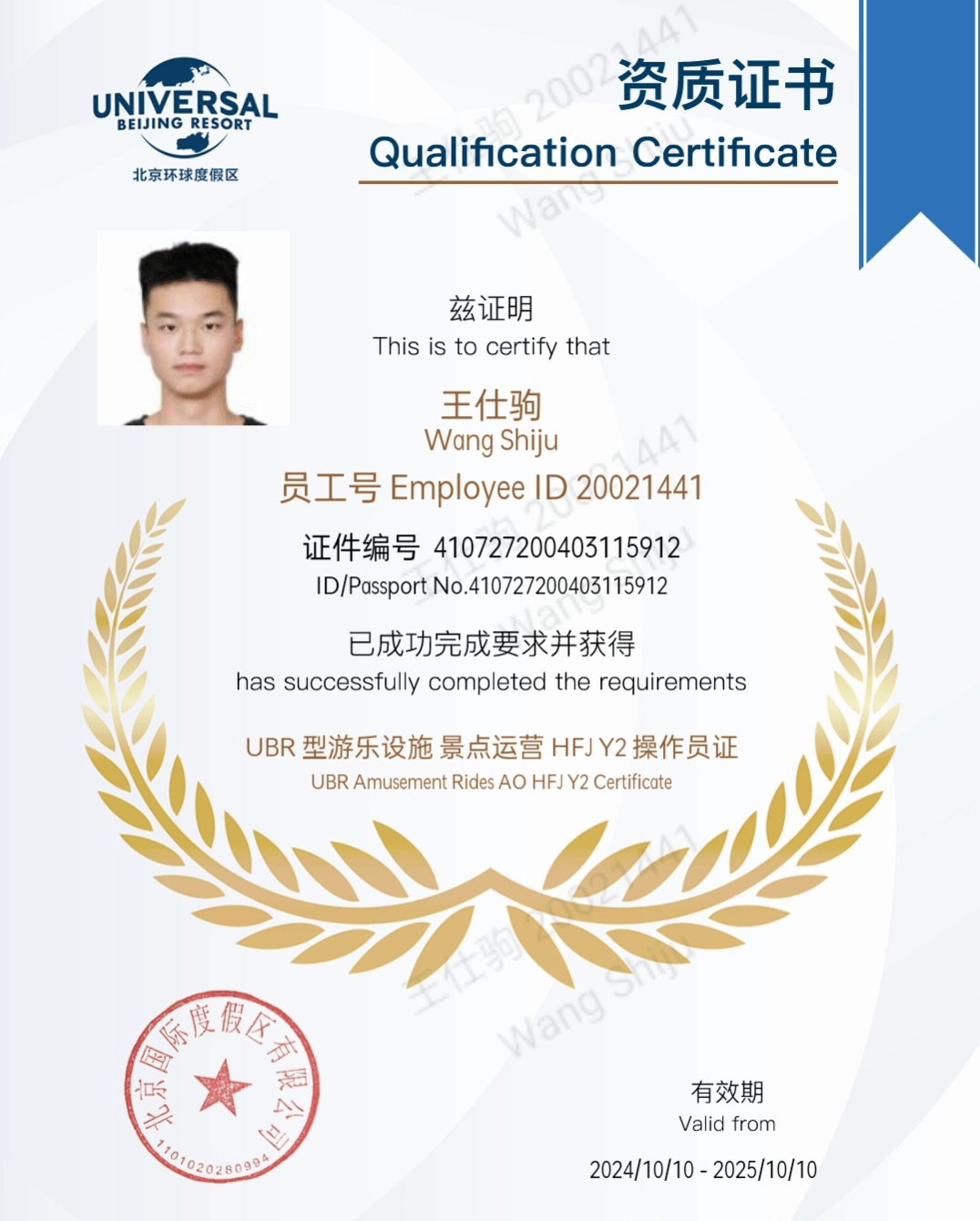 我叫王仕驹,是北京环球度假区的一名景点运营员实习生。首先我要感谢旅院,给我提供了宝贵的实习经历,在实习过程中,我深刻体会到了责任与担当的重要性,也收获了宝贵的成长与经验。