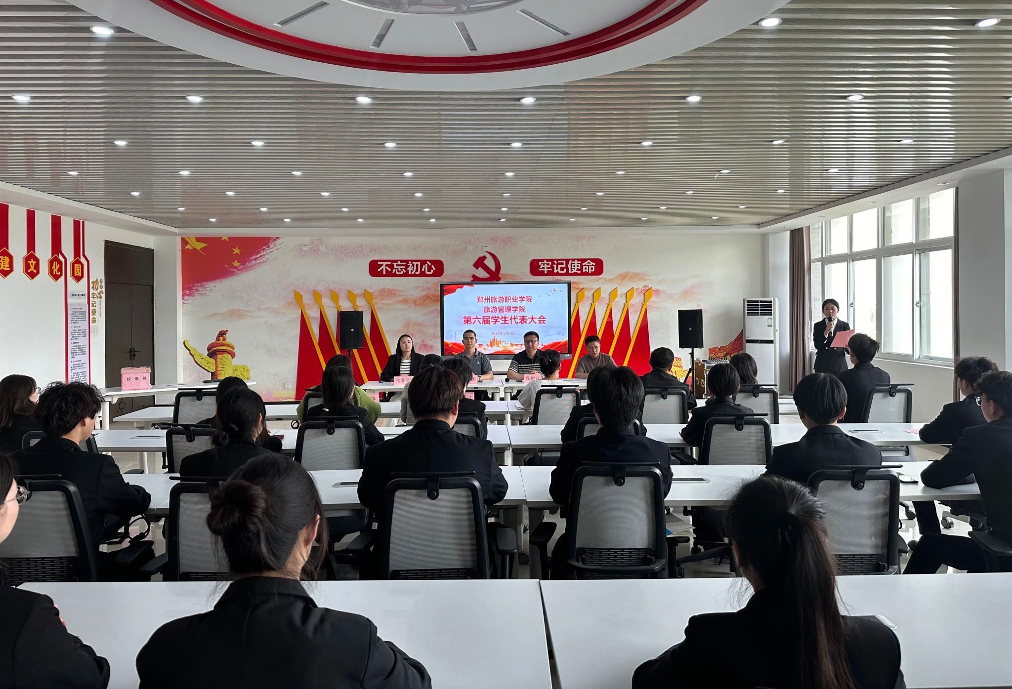 会议在庄严的国歌声中拉开帷幕。陈海彬首先发表致辞,他指出此次大会既是深化学院民主建设的关键举措,更是青年学子淬炼责任担当的实践平台。他强调,学生代表要始终秉持"从同学中来,到同学中去"的工作理念,切实做到:强化自身建设,提升思想和业务能力;深化服务意识,精准满足同学需求;通过特色活动打造活力校园文化;利用新媒体及时传递信息;在重大任务中勇于担当,维护同学权益。他勉励全体代表需"思想上与党总支同频共振,行动上与团总支同向同行",争做旅院精神的践行者、改革创新的开拓者、青春风尚的引领者。