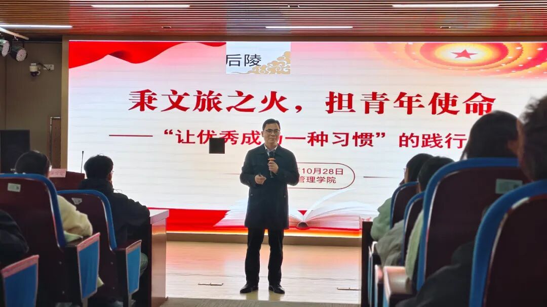 2025年10月28日,我院院长黄安定以“秉文旅之火,担青年使命——‘让优秀成为一种习惯’的践行智慧”为主题,为学院学生干部讲授专题思政课,从素养培育、成长路径到使命担当,为学生干部们搭建起“知行合一”的成长框架。