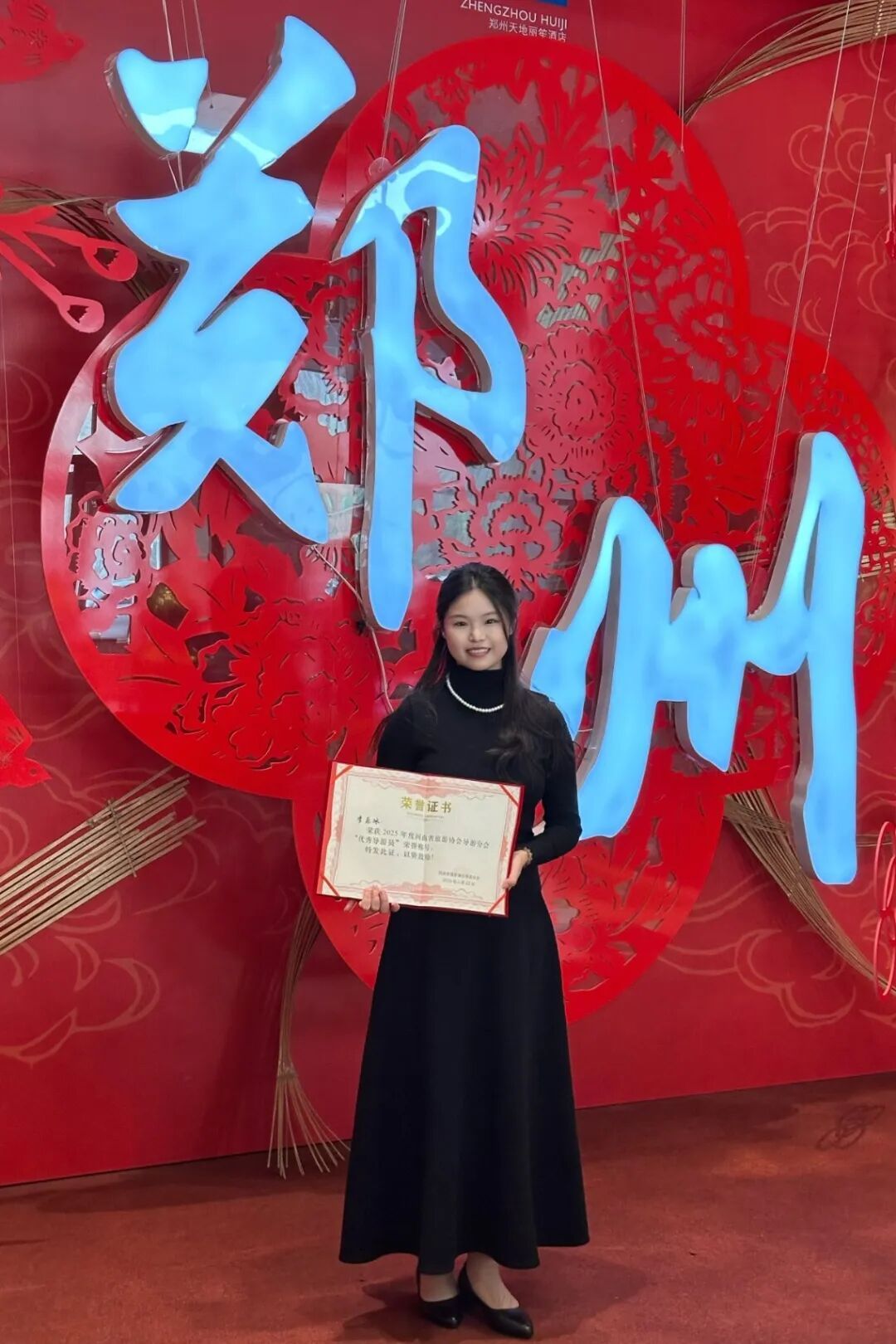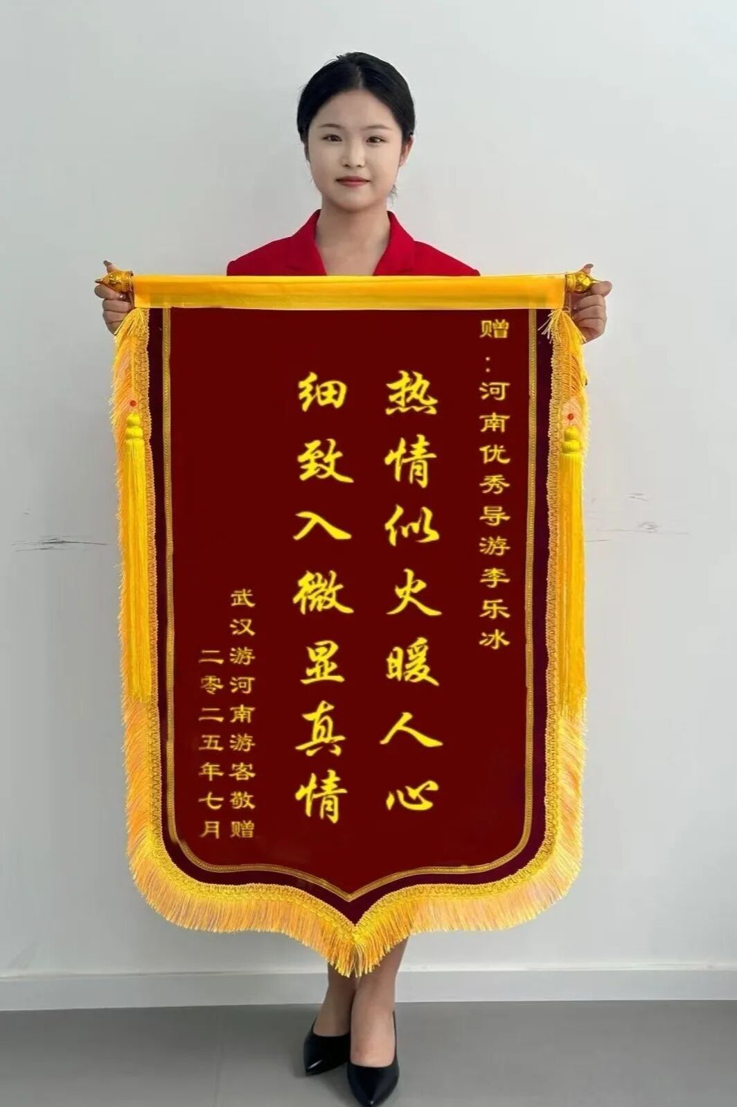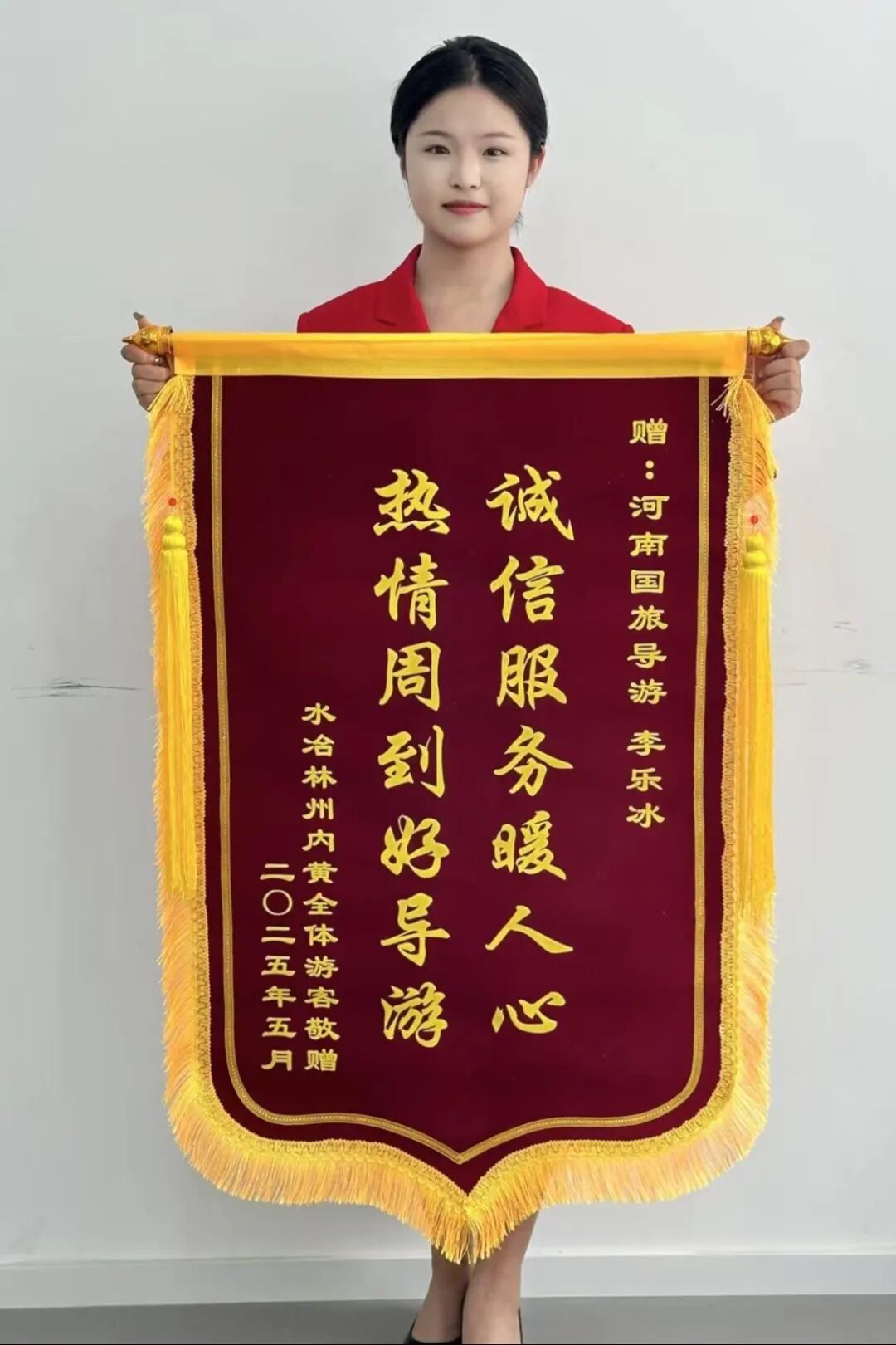 实习期间,李乐冰始终坚守服务初心,以优质、贴心的服务赢得了游客的广泛赞誉,2025年全年荣获游客赠送锦旗两面,用实干收获口碑、用服务诠释担当。2026年1月,凭借实习期间的突出表现和优异业绩,她更是接连斩获“2025河南省优秀导游”、2025年度河南省旅游协会导游分会“优秀导游员”两项重磅荣誉,成为全省导游行业青年群体中的标杆,也成为实习期间斩获省级荣誉的优秀典范。