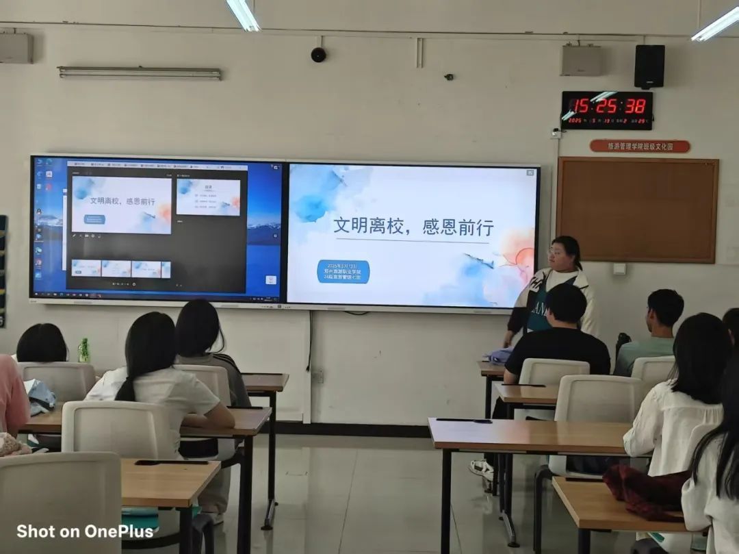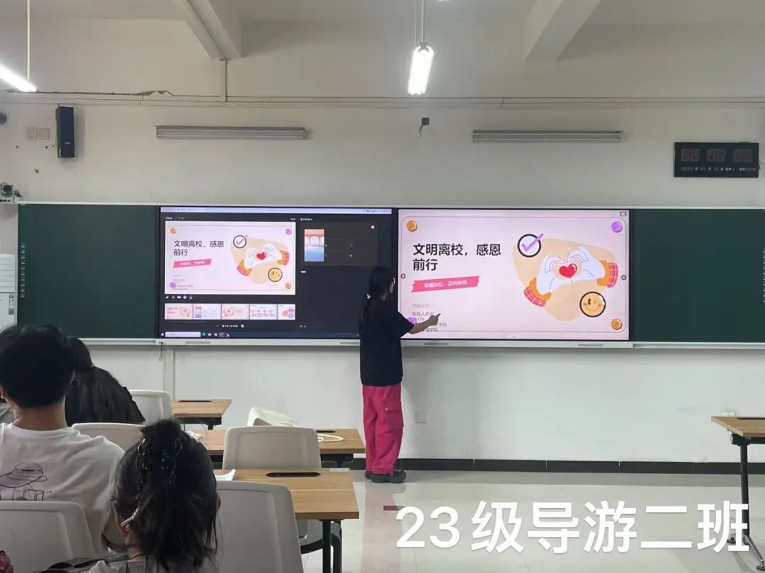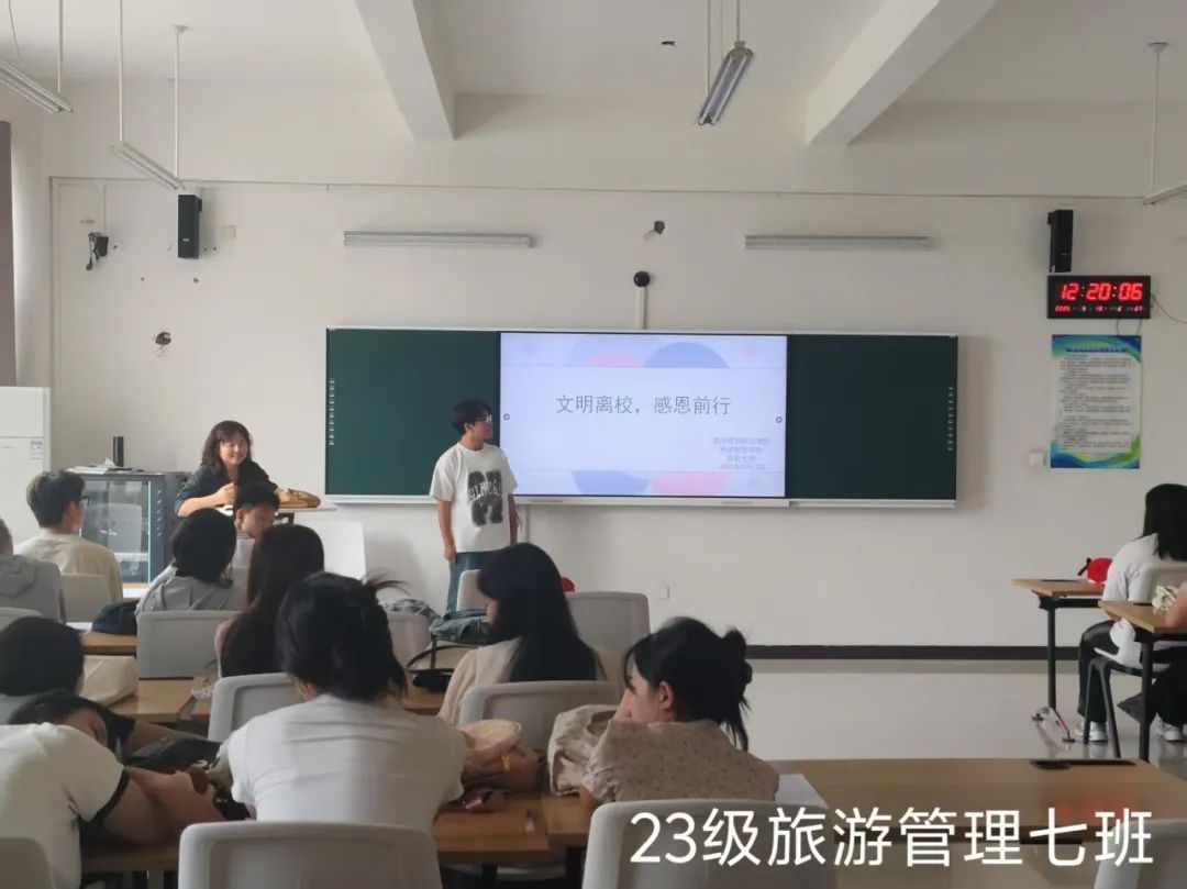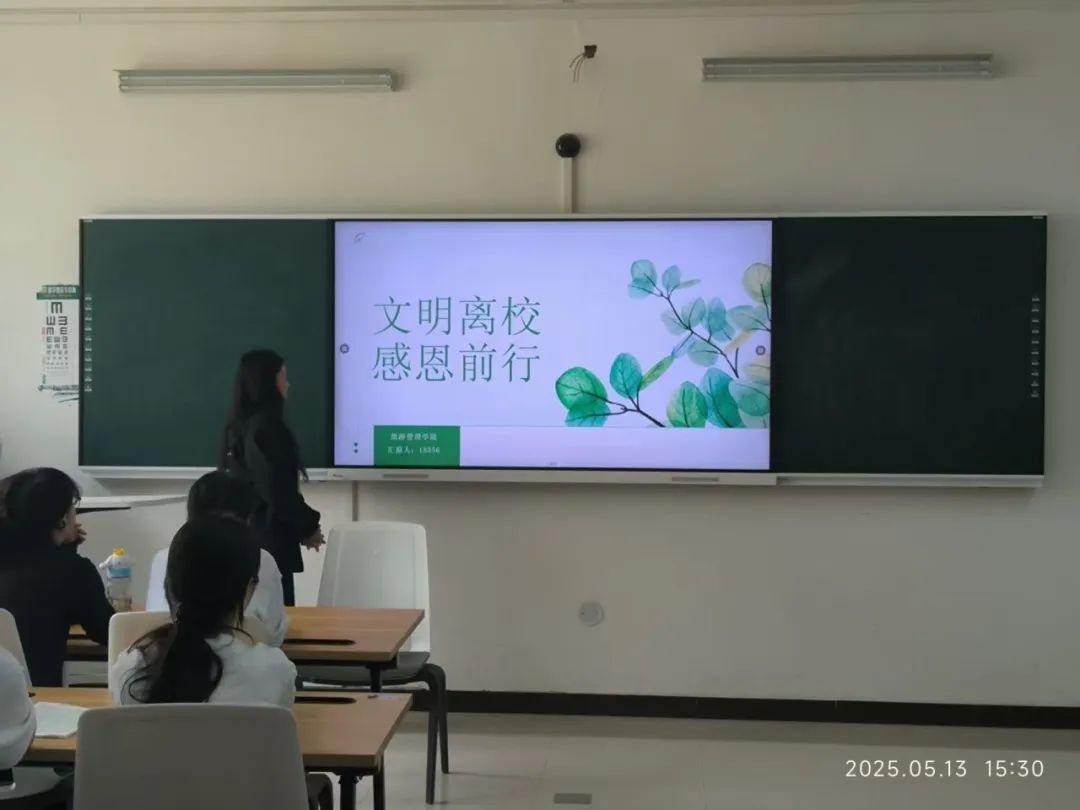 此次主题班会的召开,不仅让2023级实习生明确了文明离校的要求,更让他们感受到母校的关怀与期望。希望学生以积极向上的姿态离校,为学弟学妹树立榜样,让文明与感恩在校园中接力延续。愿每位实习生以此次教育为起点,在实习征程中行稳致远,书写属于旅管学子的精彩篇章,为文旅事业发展贡献力量!