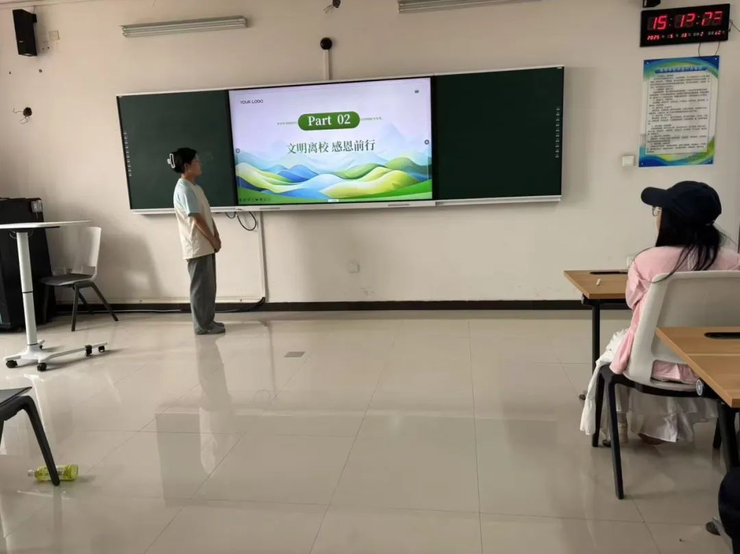 班会上,班主任围绕“文明离校行为规范”展开细致讲解。强调离校前需彻底打扫宿舍卫生,做到“人走物净”,为学弟学妹留下整洁环境;爱护公共设施,仔细检查门窗、桌椅等,如有损坏及时报修;有序搬运行李,严格遵守学校规定的时间与路线,避免影响校园秩序。通过具体规范,引导学生以实际行动践行文明,彰显旅管学子的良好风貌。