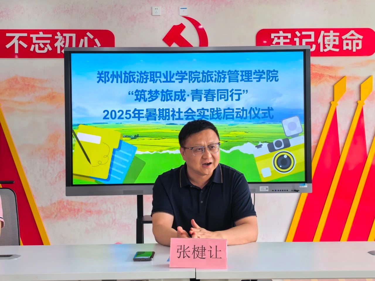 仪式上,张楗让宣布旅游管理学院2025年暑期社会实践活动正式启动。他指出,大学生社会实践活动,是青年学子锤炼思想品格、提升综合素养、服务奉献社会的生动课堂和重要平台。他勉励我院广大共青团员,要立足旅游管理专业特色,充分发挥思想引领力、组织凝聚力、专业创新力和青春行动力这四大优势,在深入文旅政务一线见习、扎根基层服务群众、投身乡村振兴主战场的火热实践中, 以实际行动践行“高举团旗跟党走”的初心使命,用扎实的专业学识和饱满的青春热情,为地方文旅发展贡献智慧与力量!